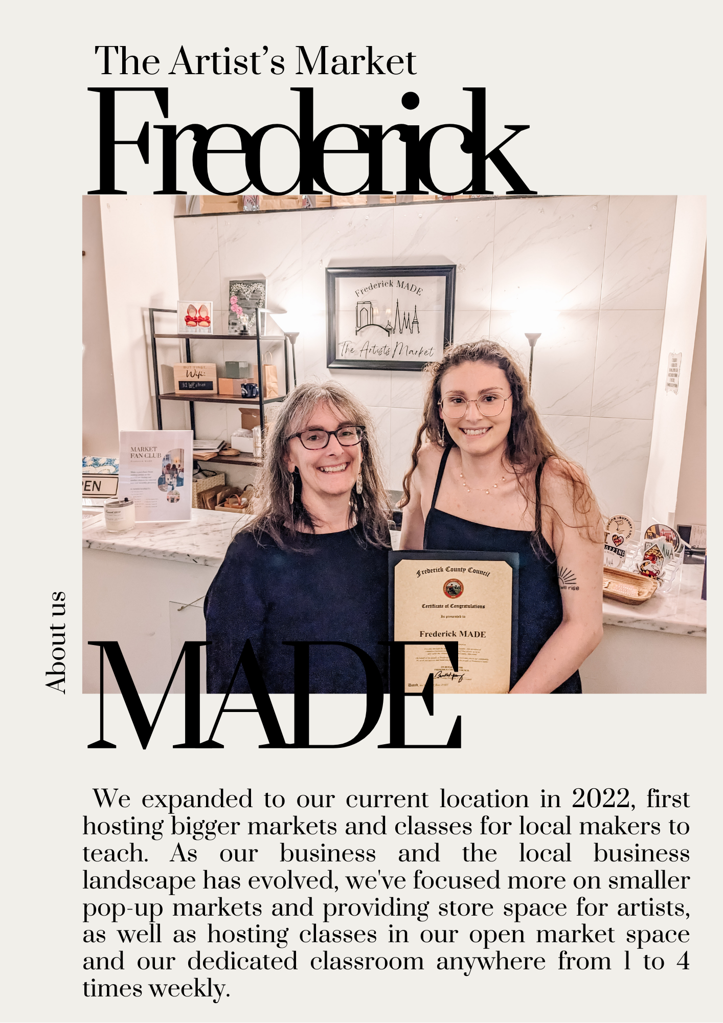 It has been a gift to run a business that is so special to the community. Since we first opened our doors, it has been my job to make Frederick MADE whatever it needed to be at that time. As we enter 2025, we begin a new chapter, saying goodbye to our Artist's Market and location at The FSK Hotel.