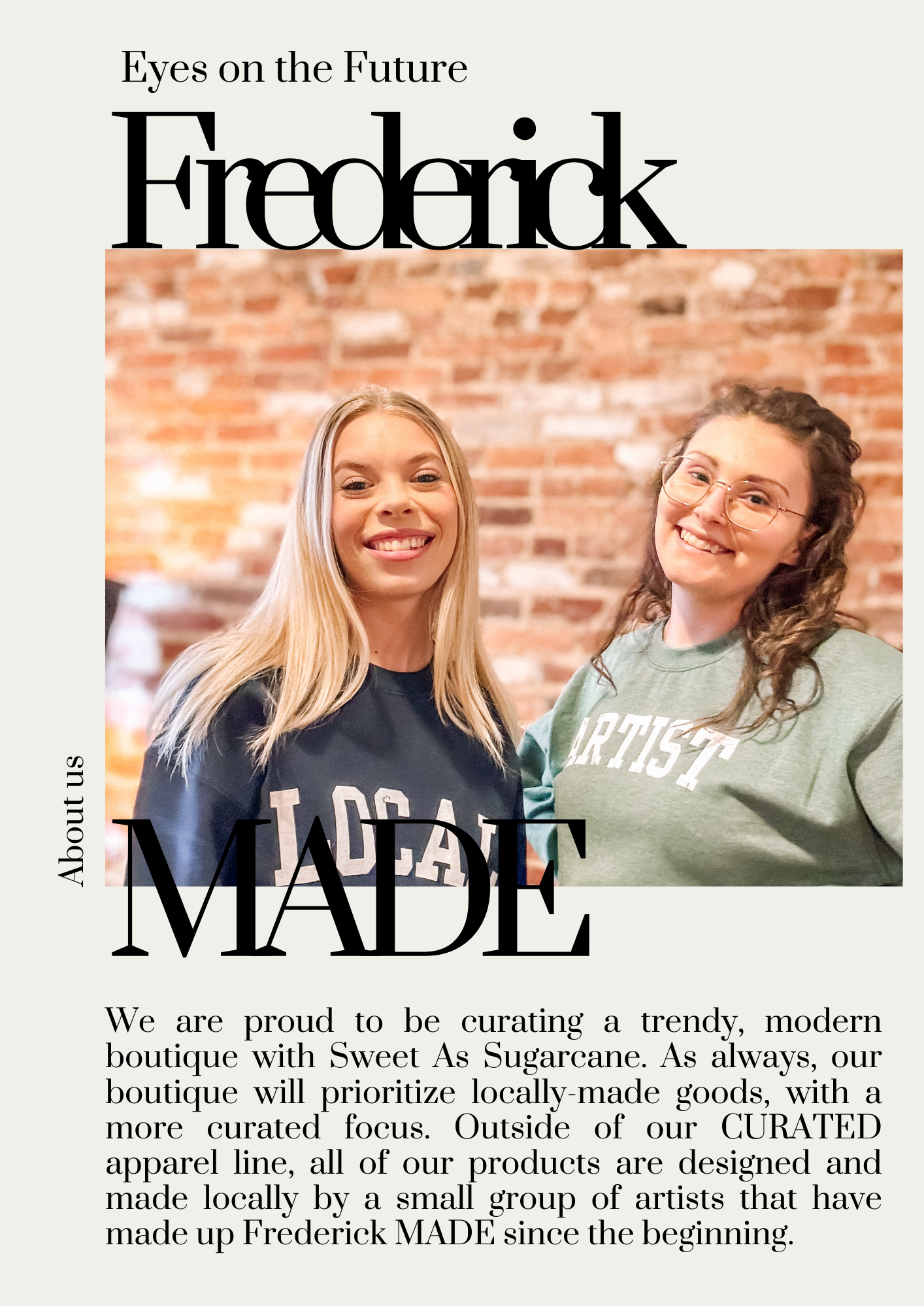 Frederick MADE works to curate a modern, trendy boutique with an emphasis on locally-made items. We work with a small group of local artists to provide handmade jewelry, accessories, candles, stationary, artwork and more, alongside a collection of curated clothing and gift items.