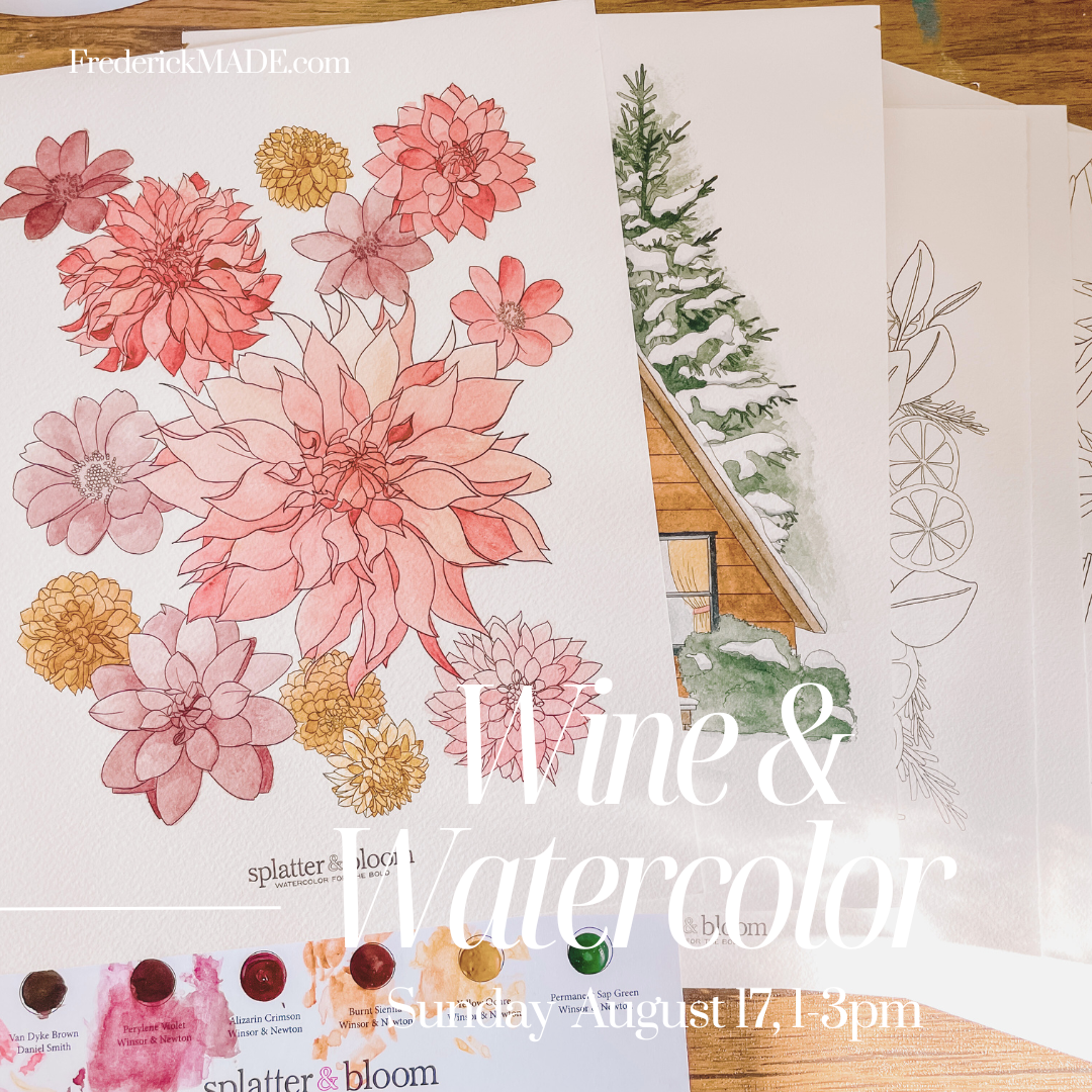 Self-guided watercolor experience at Frederick MADE. Each ticket includes one glass of wine (or soda), two pre-traced watercolor designs on 5x7 paper (ready to frame!) and all other paint supplies.
