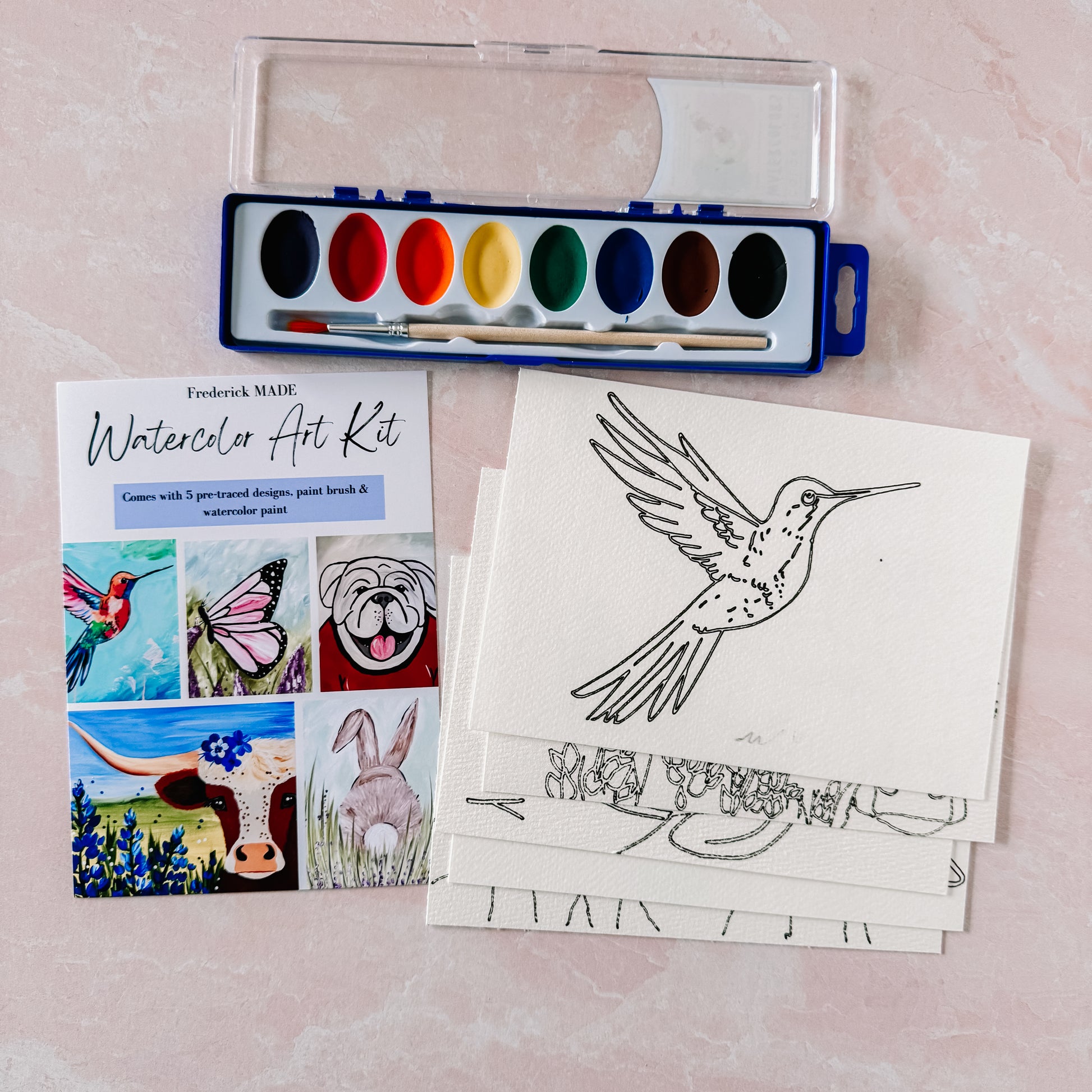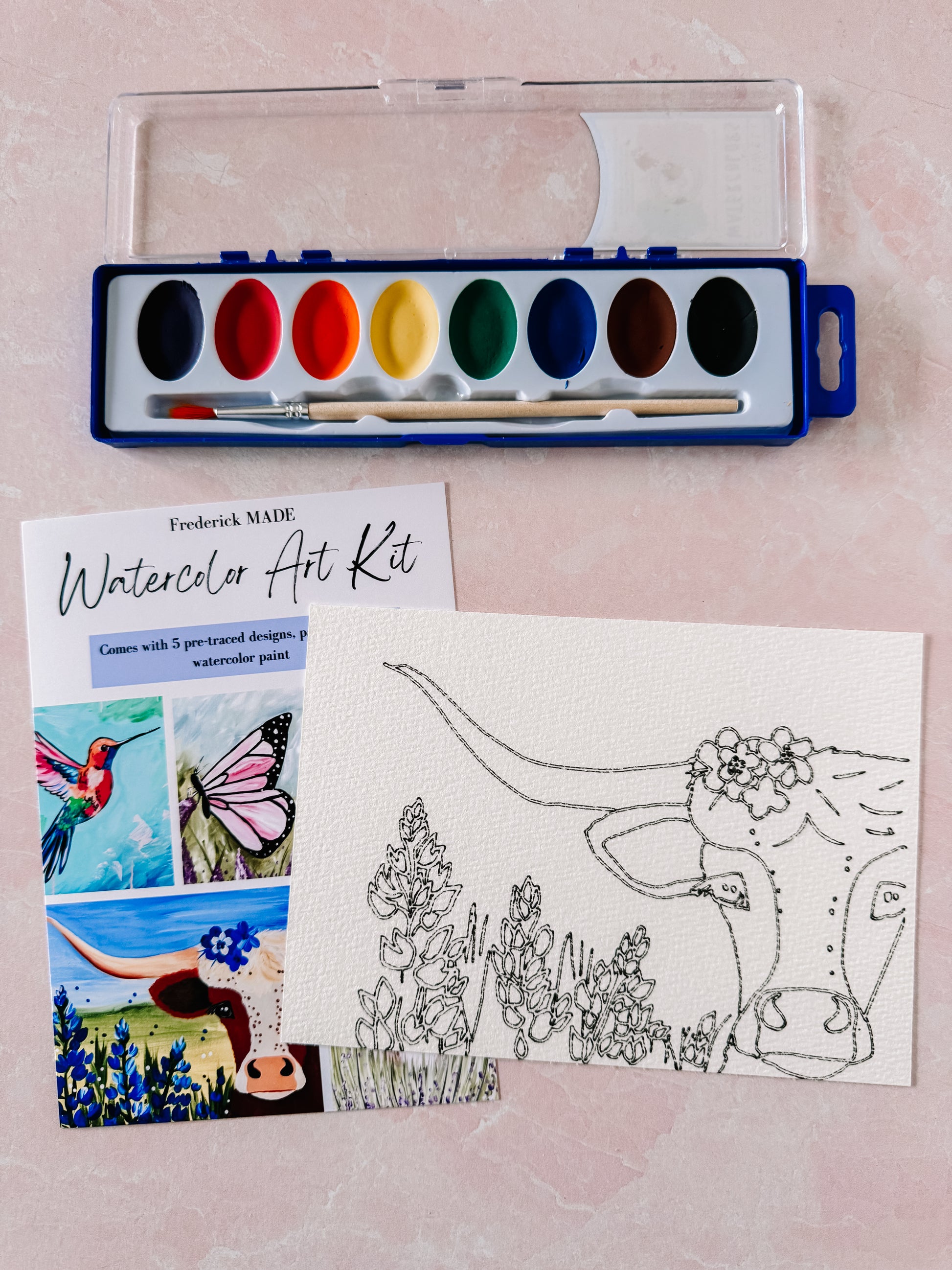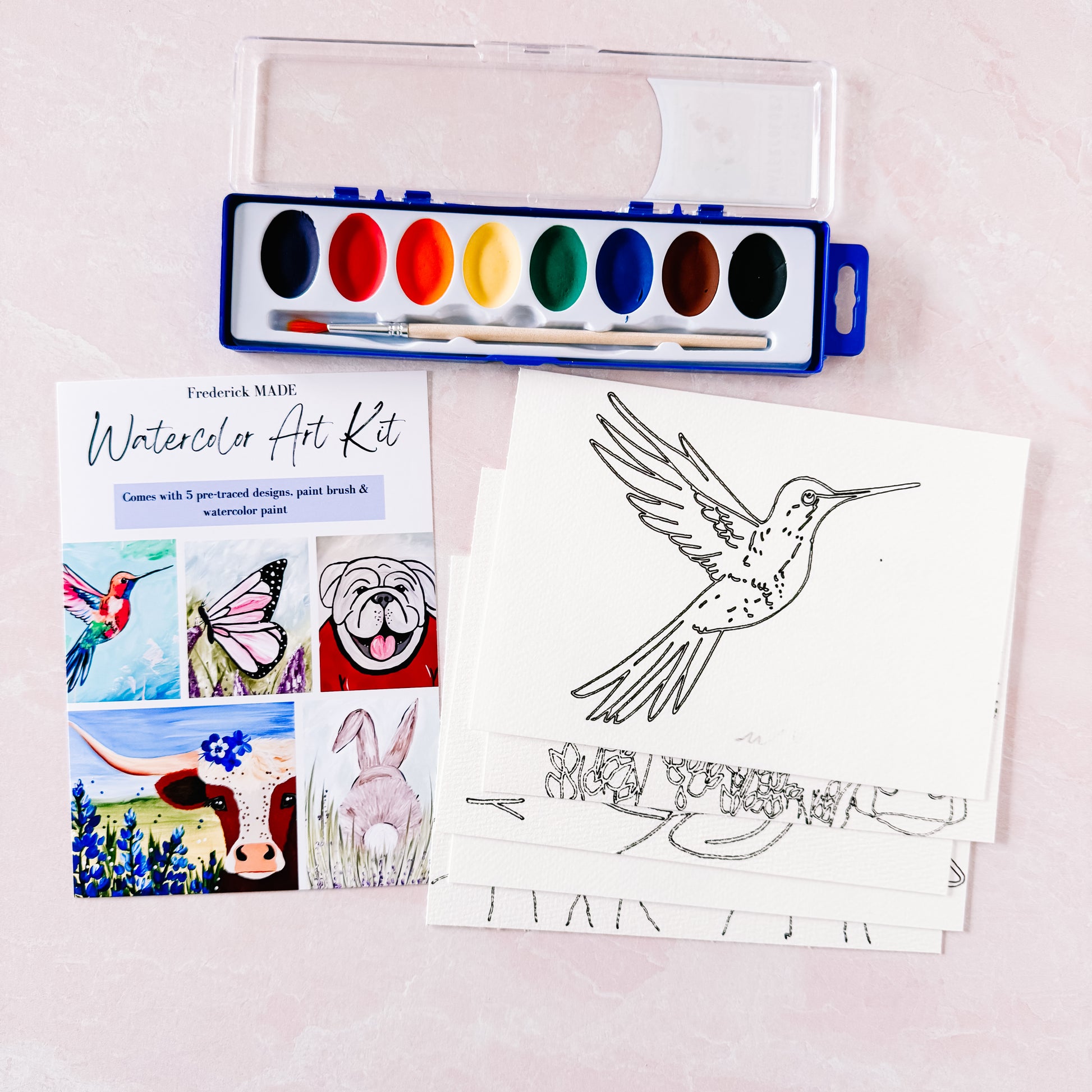 These kits are designed and made in-house. Each kit comes with 5 pre-traced designs on watercolor paper, a watercolor tip sheet (new), swatch card to practice your designs, and practice sheet, PLUS an 8-color set of watercolor paint and paint brush.