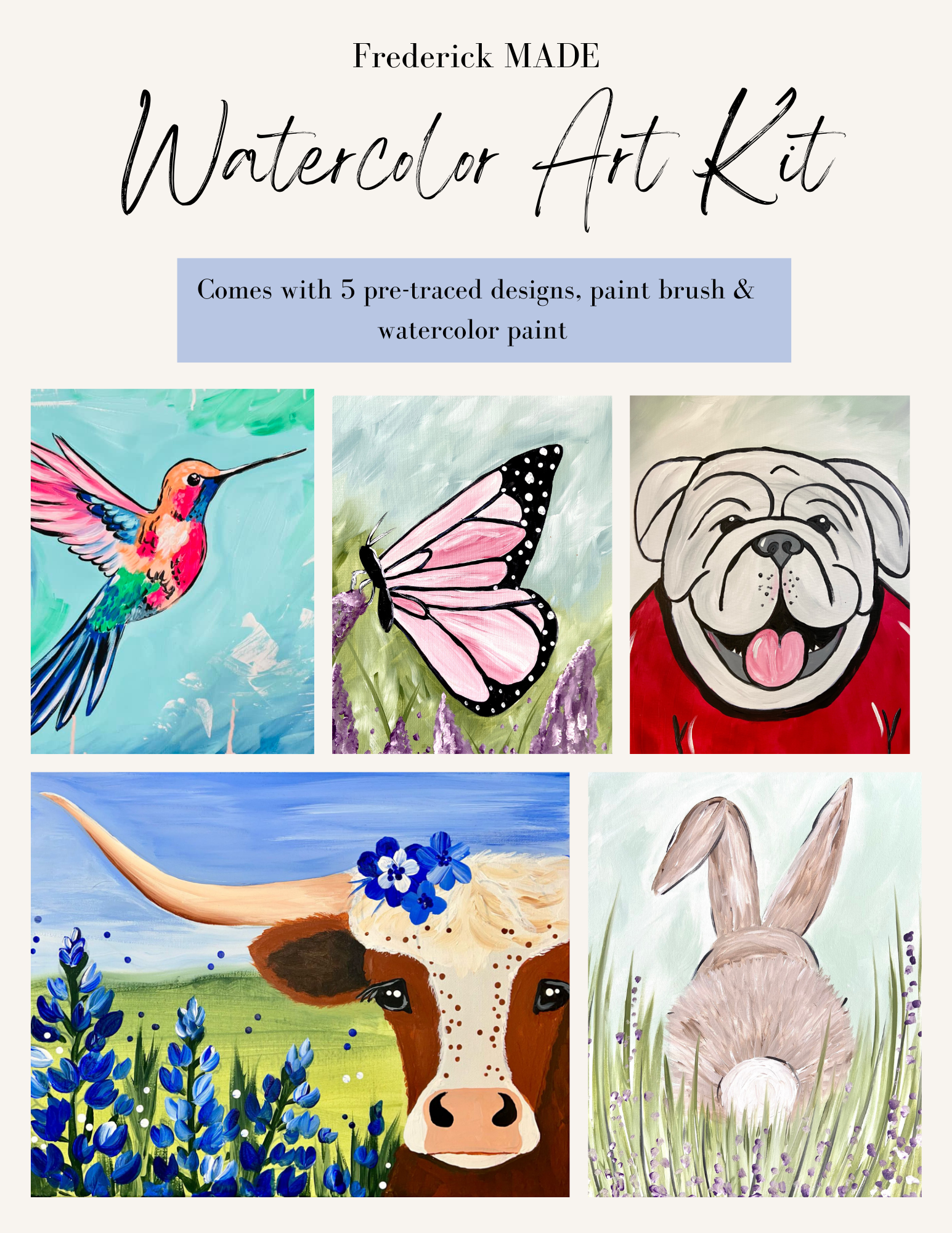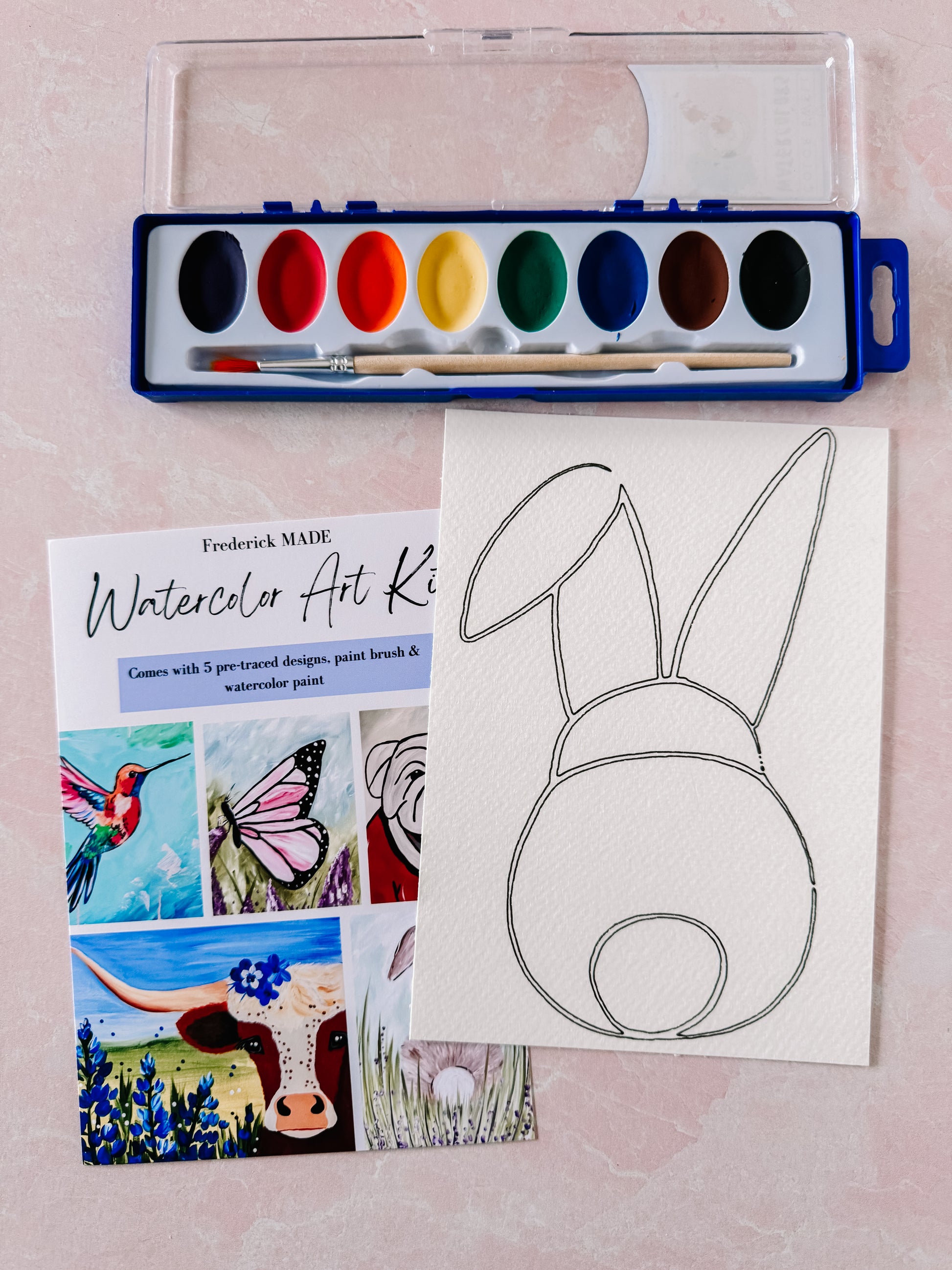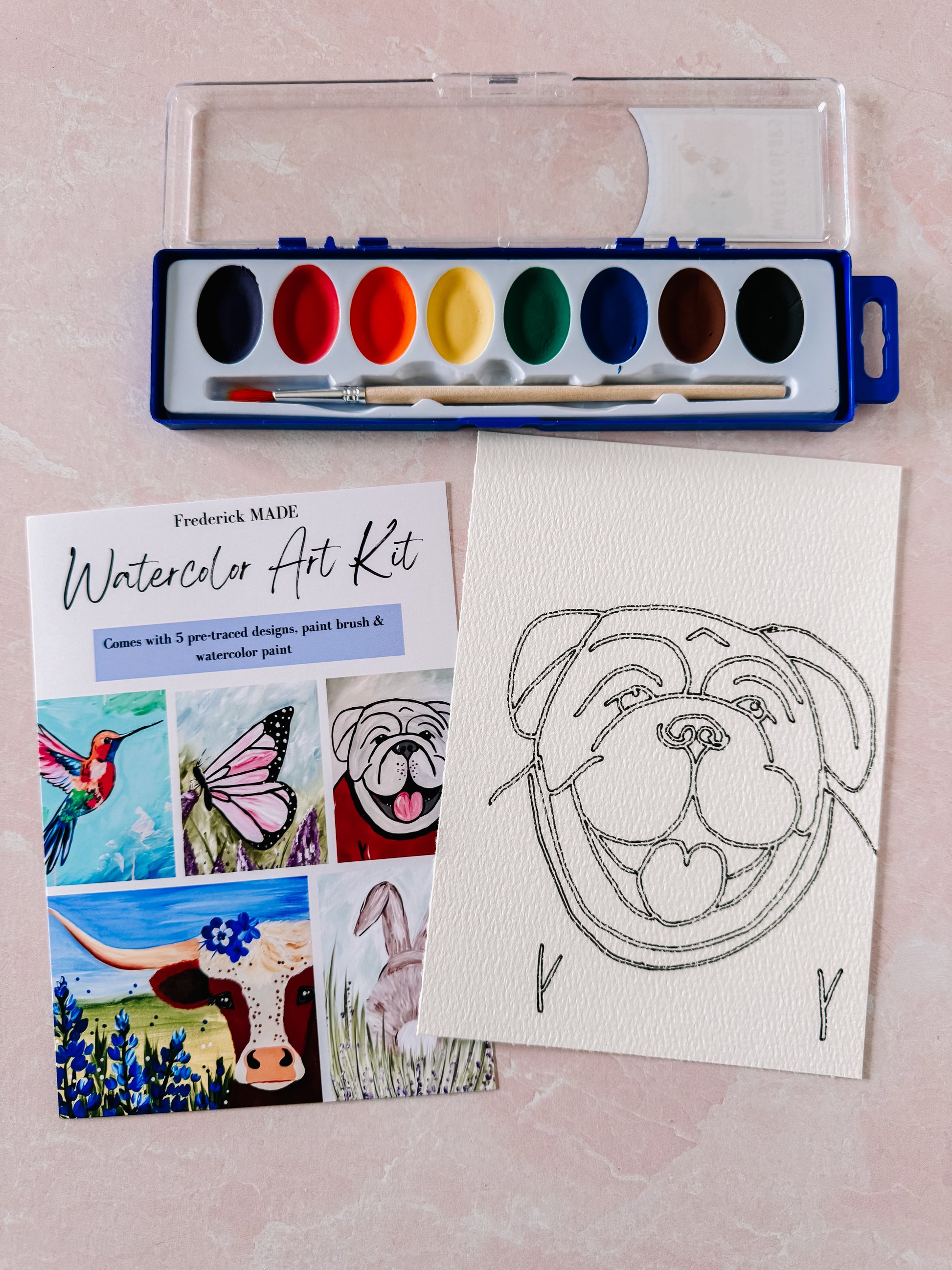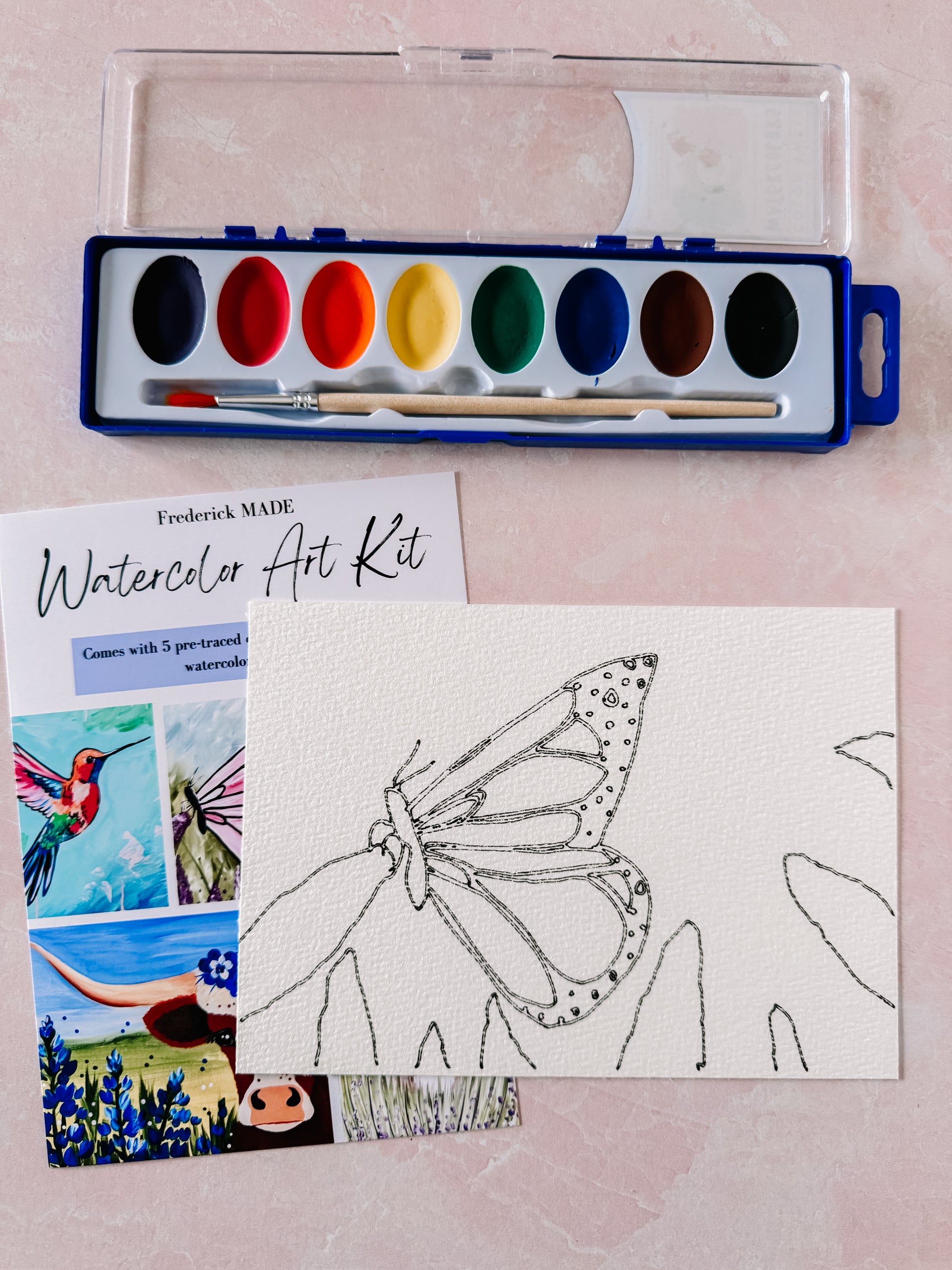 These kits are designed and made in-house. Each kit comes with 5 pre-traced designs on watercolor paper, a watercolor tip sheet (new), swatch card to practice your designs, and practice sheet, PLUS an 8-color set of watercolor paint and paint brush.