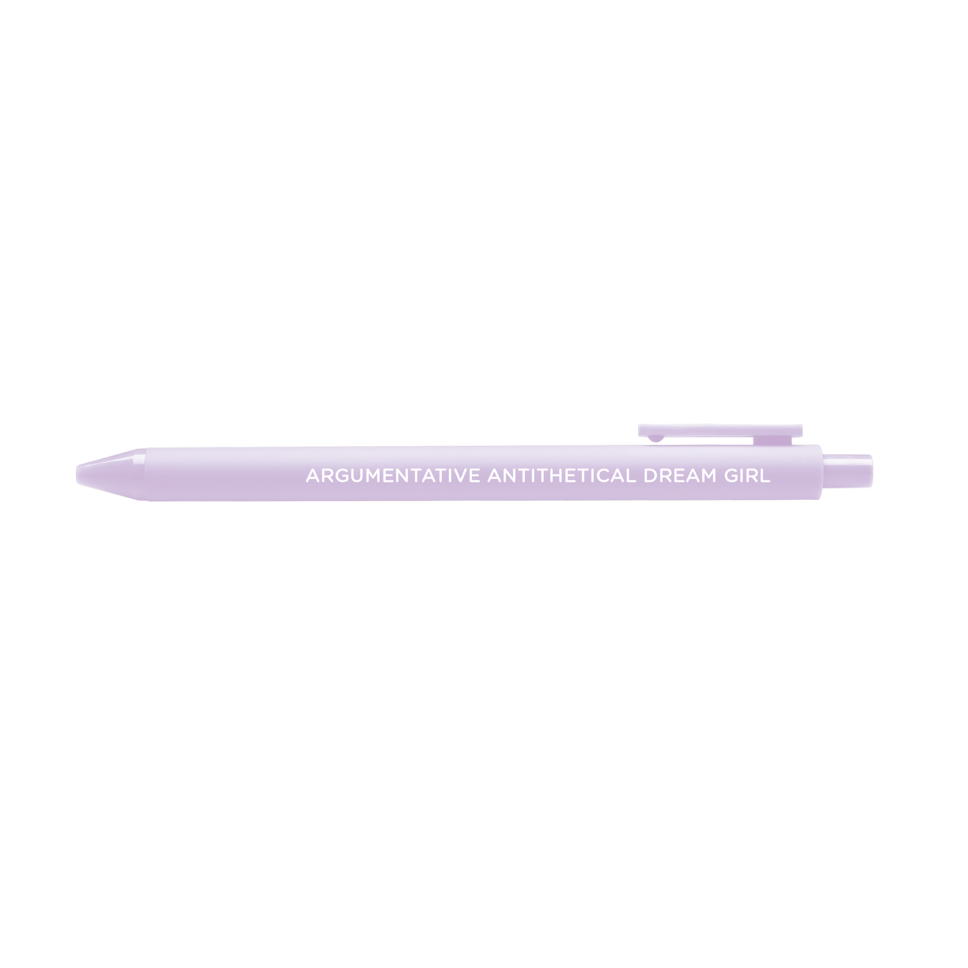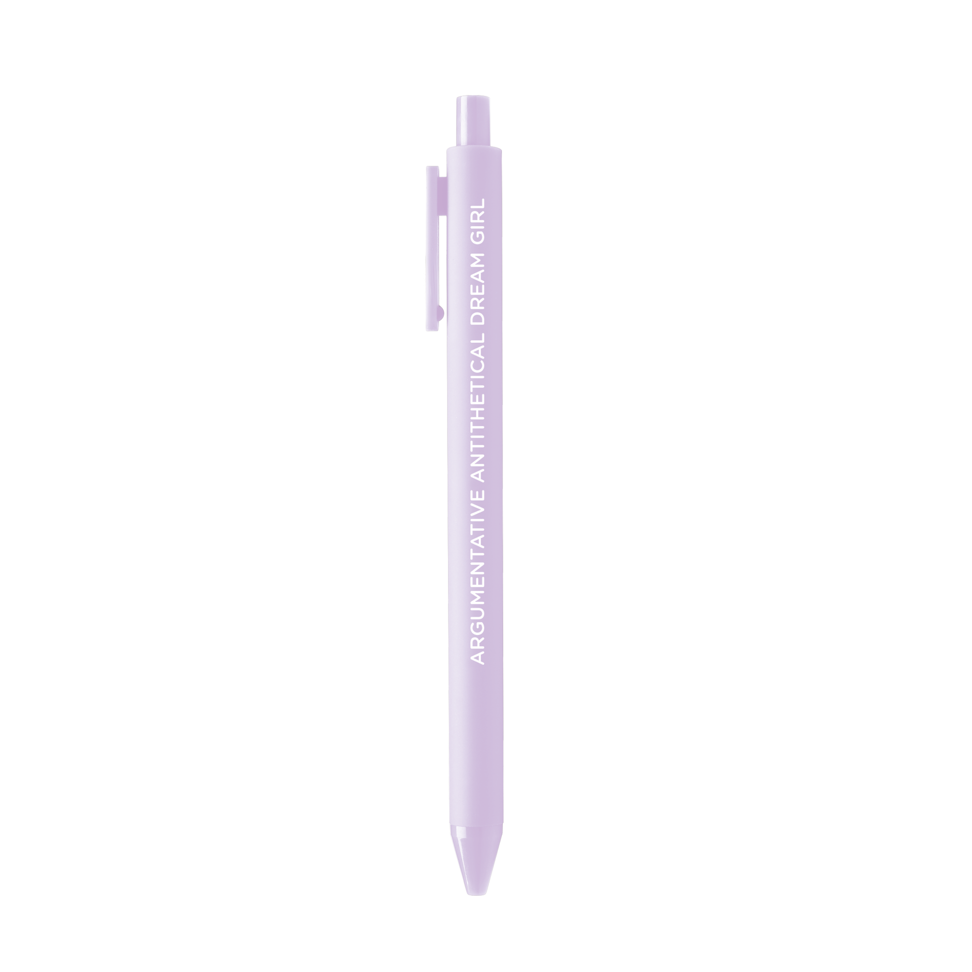 Write down all of your late night thoughts with the Argumentative Antithetical Dream Girl pen from the Midnight Musings Pen Set! This jotter gel pen is inspired by Taylor's Hits Different from the Midnights album. The lyric is embossed on a lilac pen barrel with lilac gel ink. Check out the full set and more in our Swiftie Stationery section in our shop!