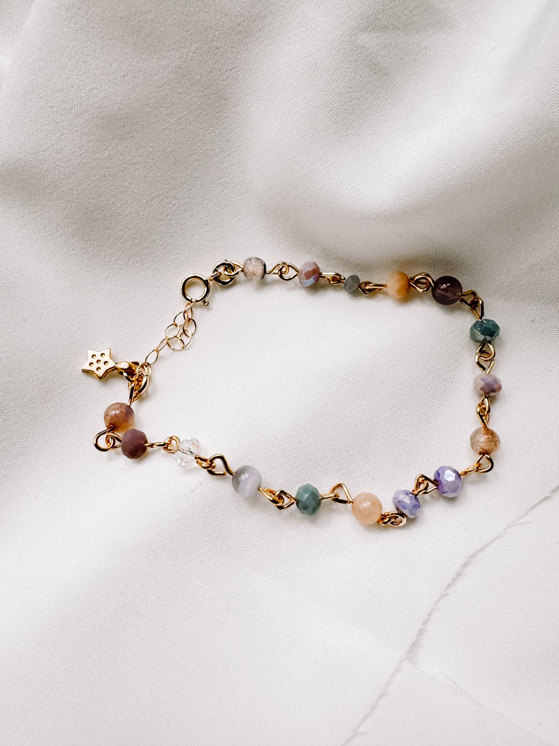 Handmade beaded chain with a combination of glass and stone beads. Gold-plated and adjustable with our signature star charm.