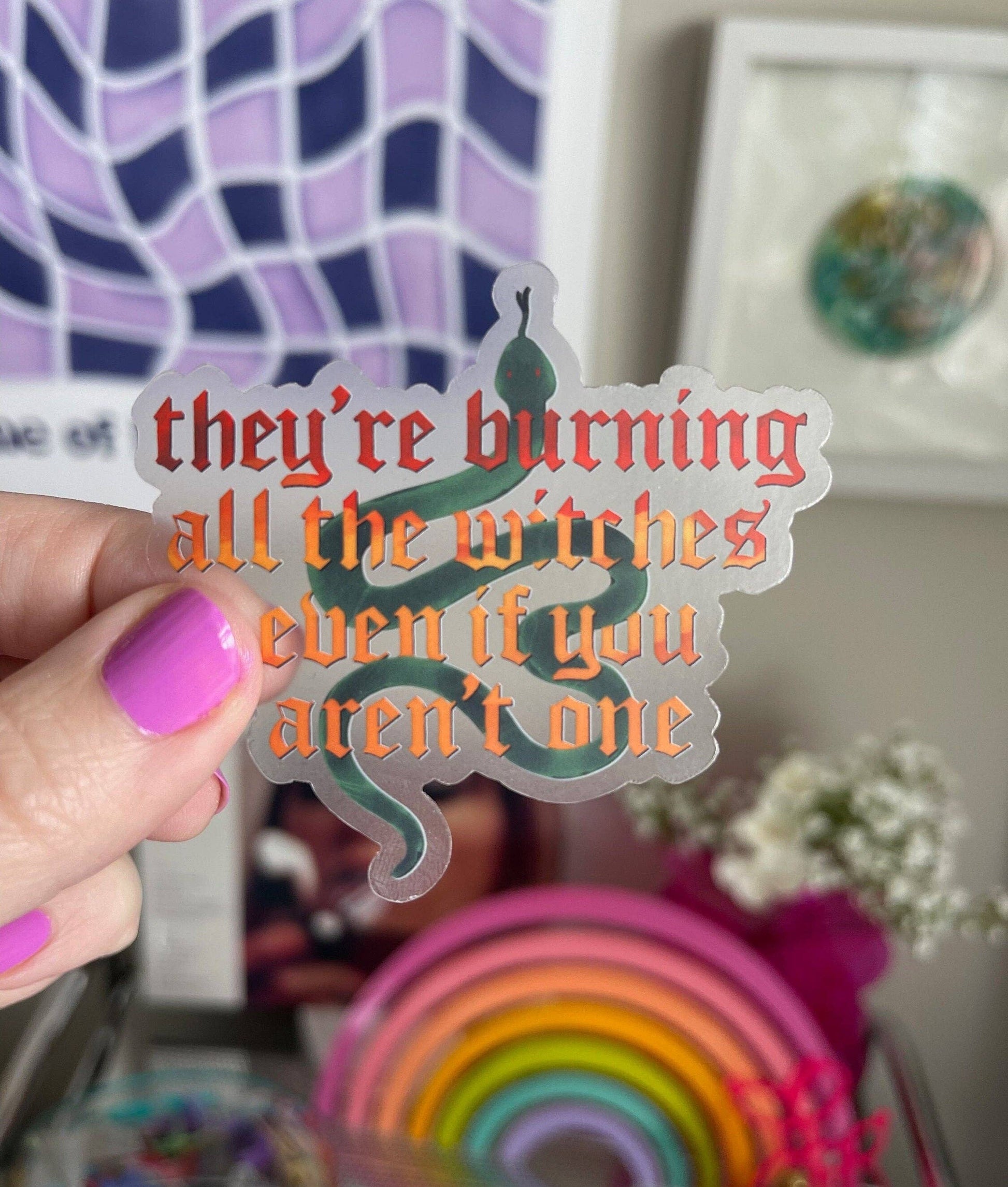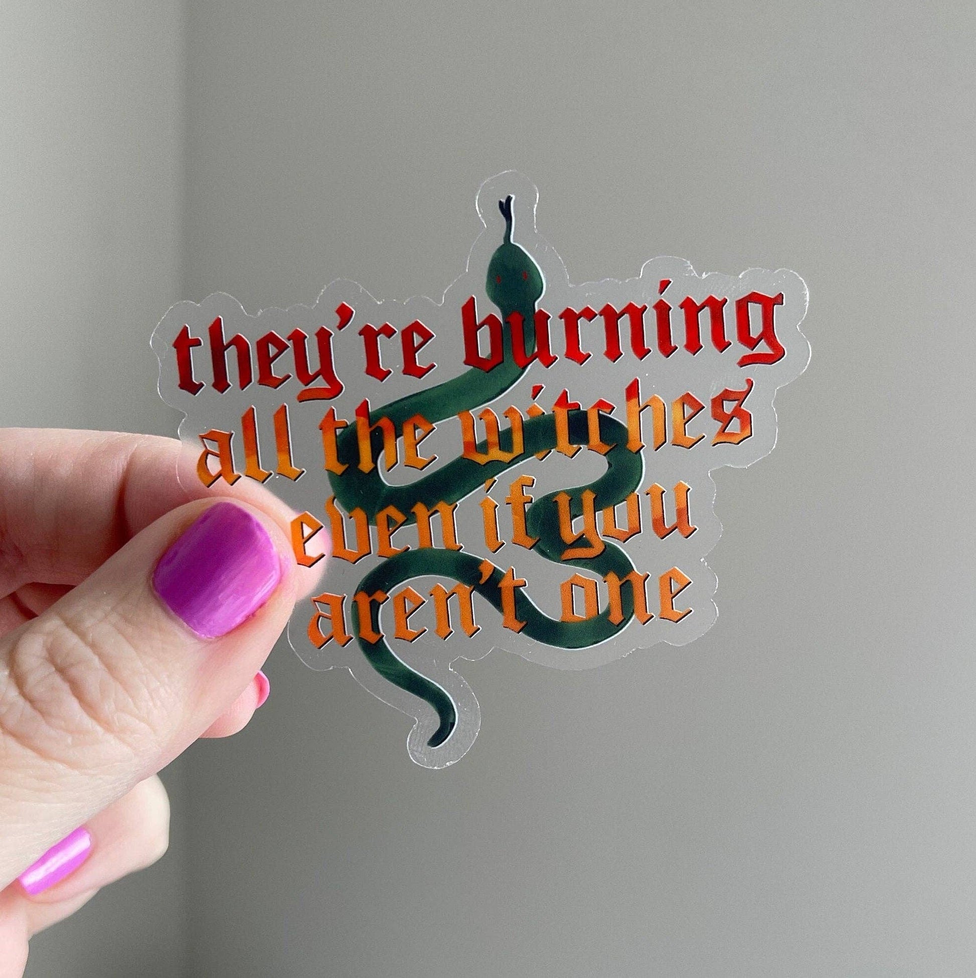 An homage to the iconic Taylor Swift Reputation era. This sticker features a green snake intertwined with lettering with a fire effect showcasing the lyrics “they're burning all the witches even if you aren't one” in rep era lettering. Channel that "I Did Something Bad" rep era energy with this sticker! The sticker is made from CLEAR waterproof and weatherproof vinyl.