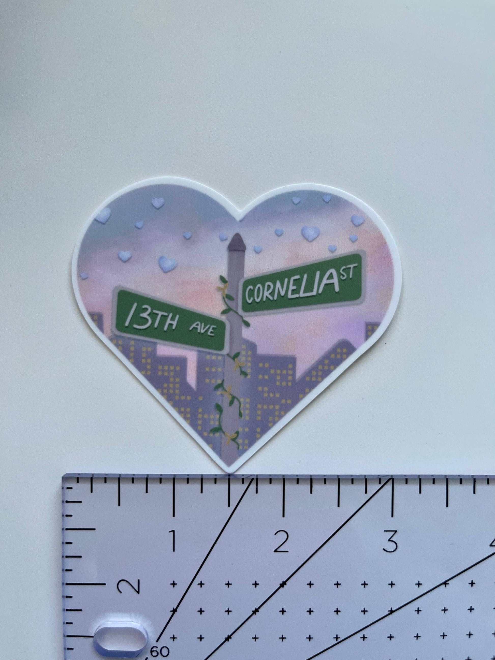 Who doesn’t love the Lover era?!? This sticker is inspired by the song “Cornelia Street” and the pinks and blues of Taylor Swift’s Lover era. The heart shaped sticker features a city skyline in the background with a Cornelia Street floral and ivy wrapped street sign in the foreground (with an imagined intersection with 13th Ave). The cotton candy sky features blueish silver hearts. Perfect for any Swiftie! The sticker is printed on waterproof and weatherproof vinyl.
