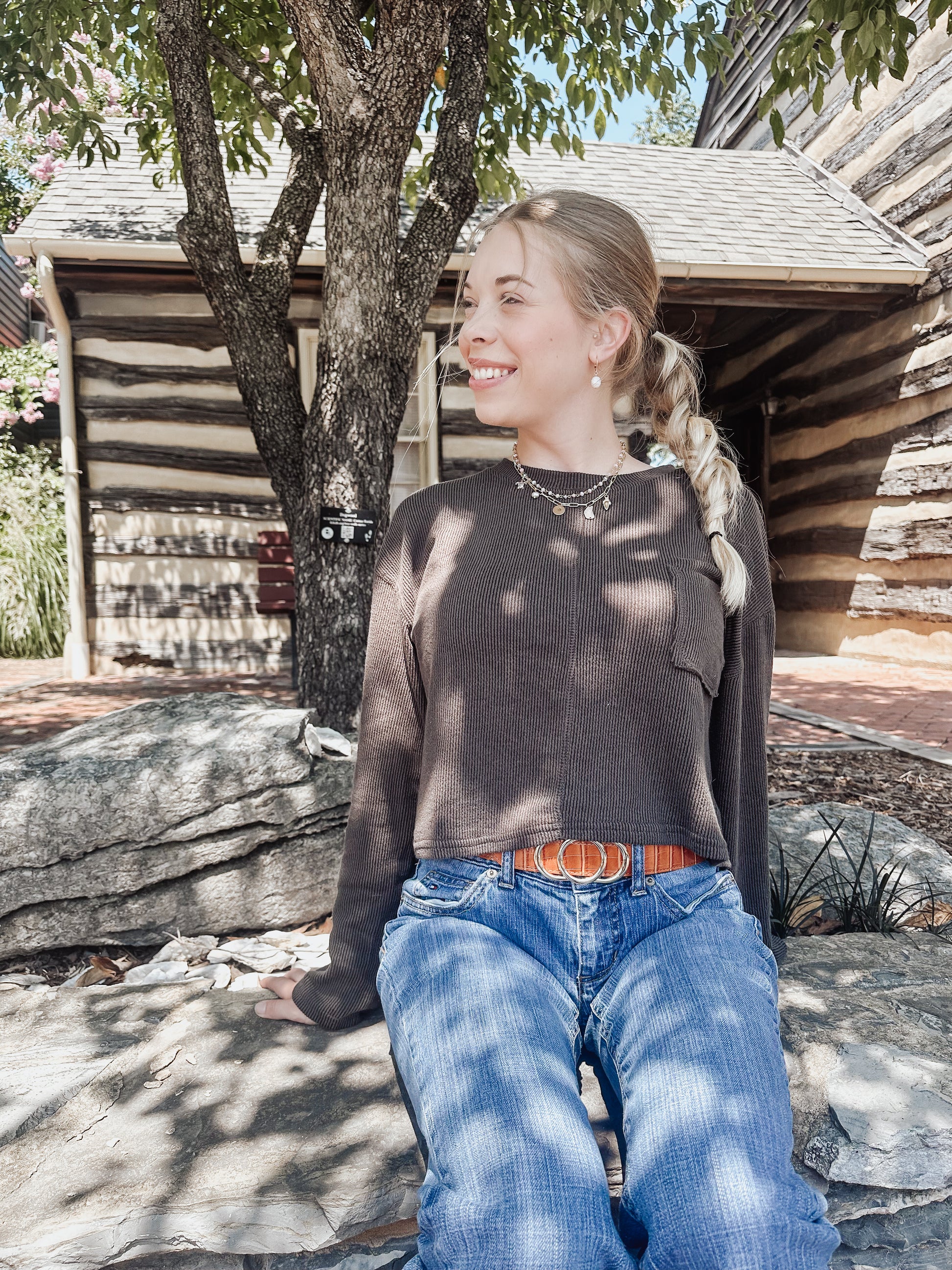 Super soft lightweight crop top in espresso. Long sleeve, ribbed fabric. Machine washable