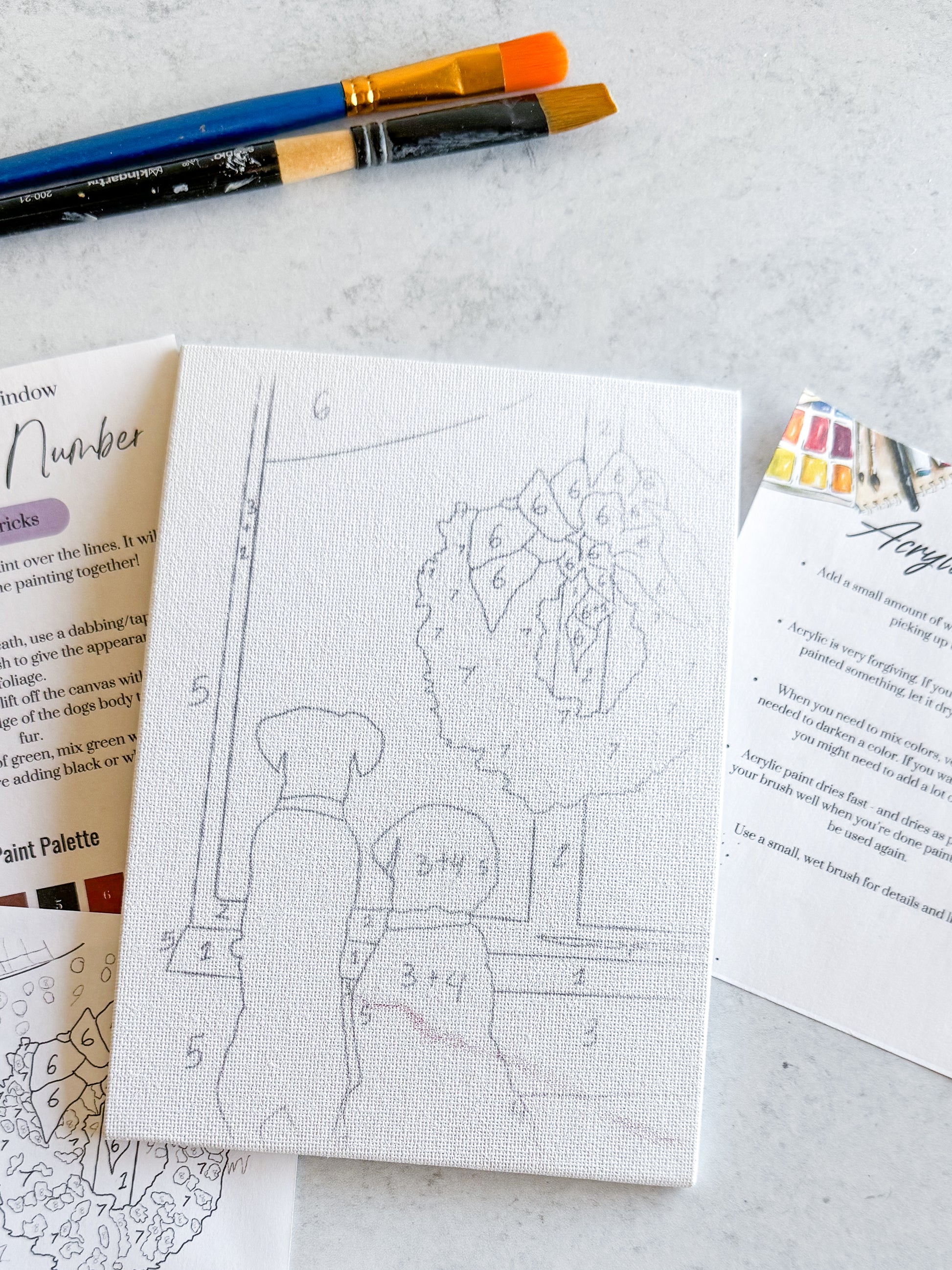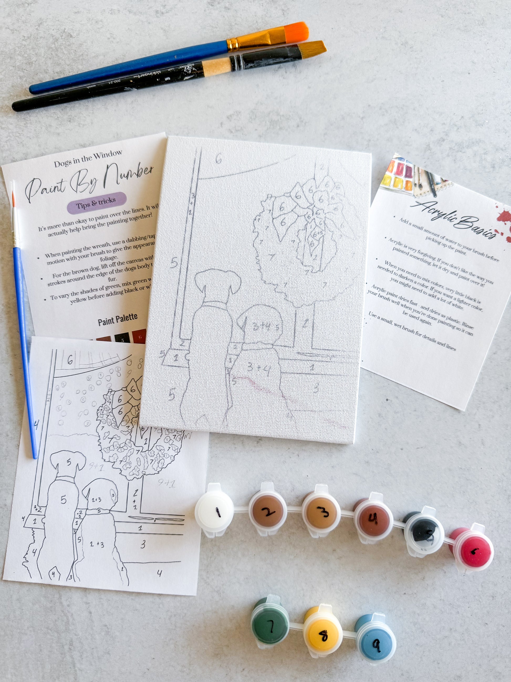 All paint kits also have an acrylic basics tip sheet, reference diagram for the paint by number and a cheat sheet for the specific painting, including number guide.