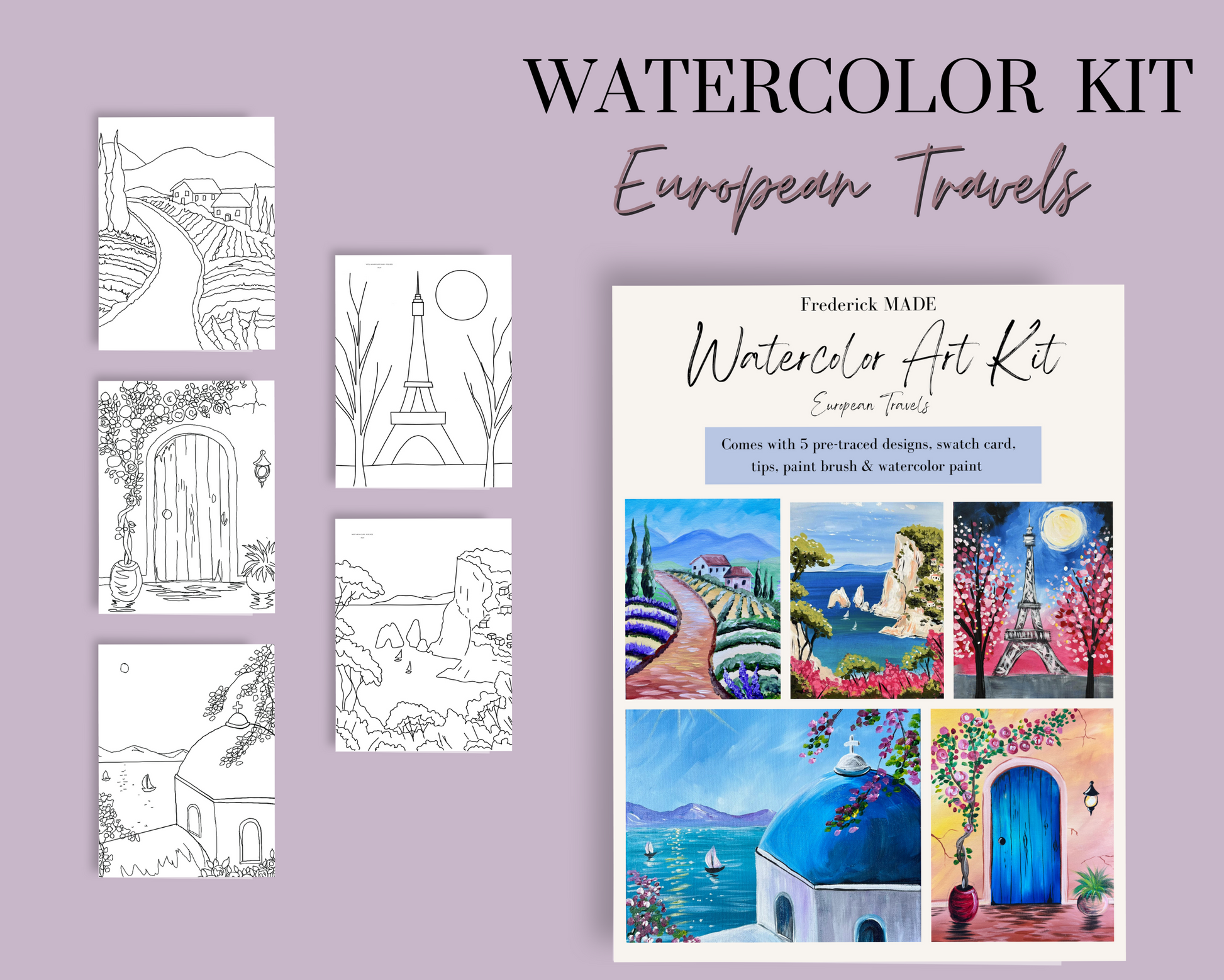 These kits are designed and made in-house. Each kit comes with 5 pre-traced designs on watercolor paper, a watercolor tip sheet (new), swatch card to practice your designs, and practice sheet, PLUS an 8-color set of watercolor paint and paint brush.