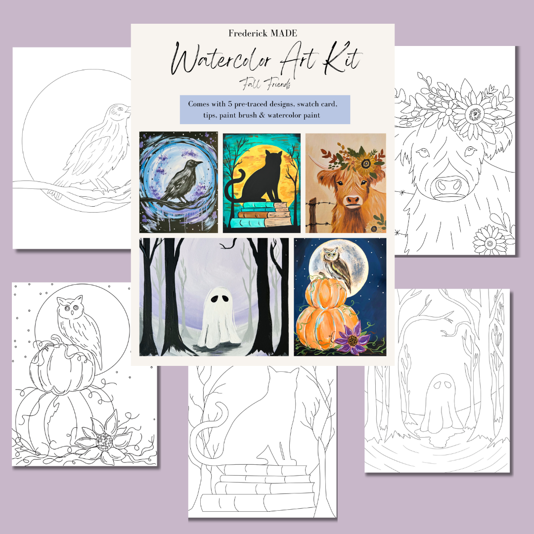 These kits are designed and made in-house. Each kit comes with 5 pre-traced designs on watercolor paper, a watercolor tip sheet (new), swatch card to practice your designs, and practice sheet, PLUS an 8-color set of watercolor paint and paint brush.