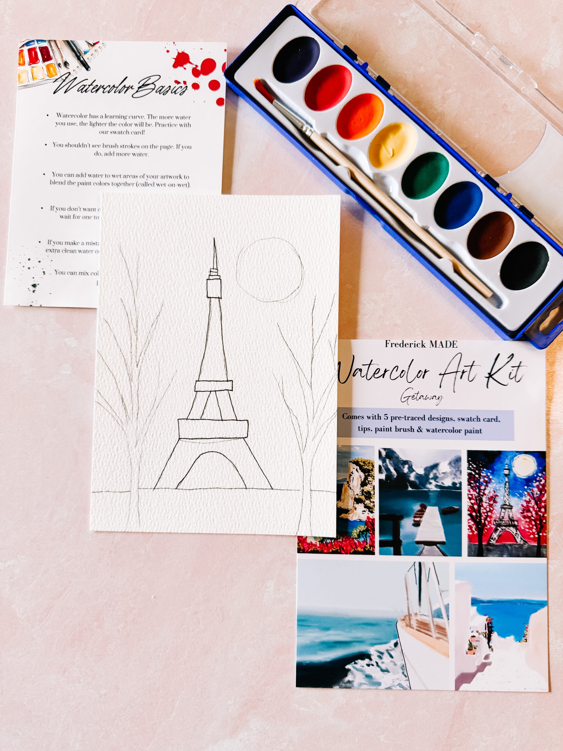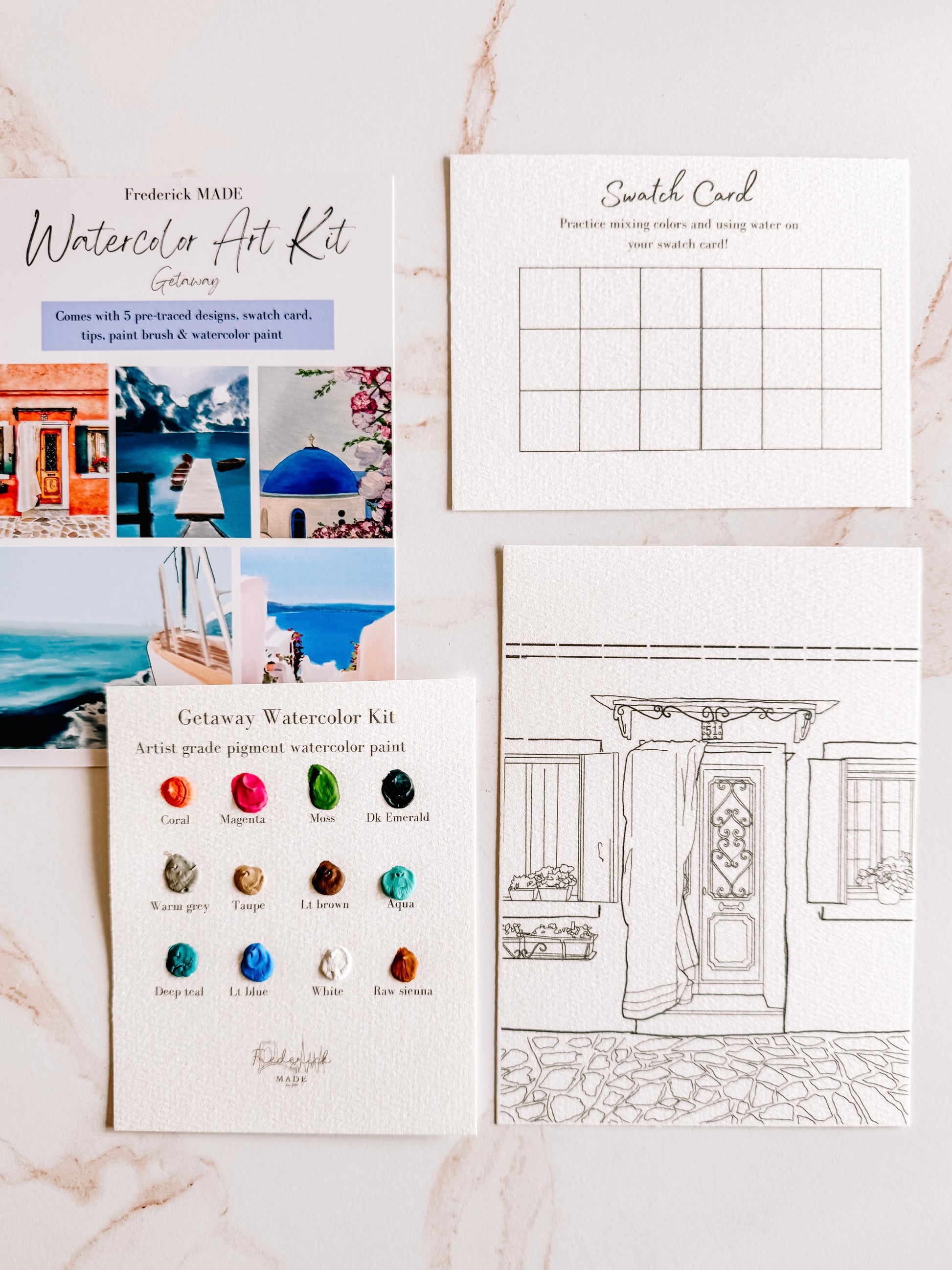 These kits are designed and made in-house. Each kit comes with 5 pre-traced designs on watercolor paper, a watercolor tip sheet (new), swatch card to practice your designs, and practice sheet, PLUS an 8-color set of watercolor paint and paint brush.