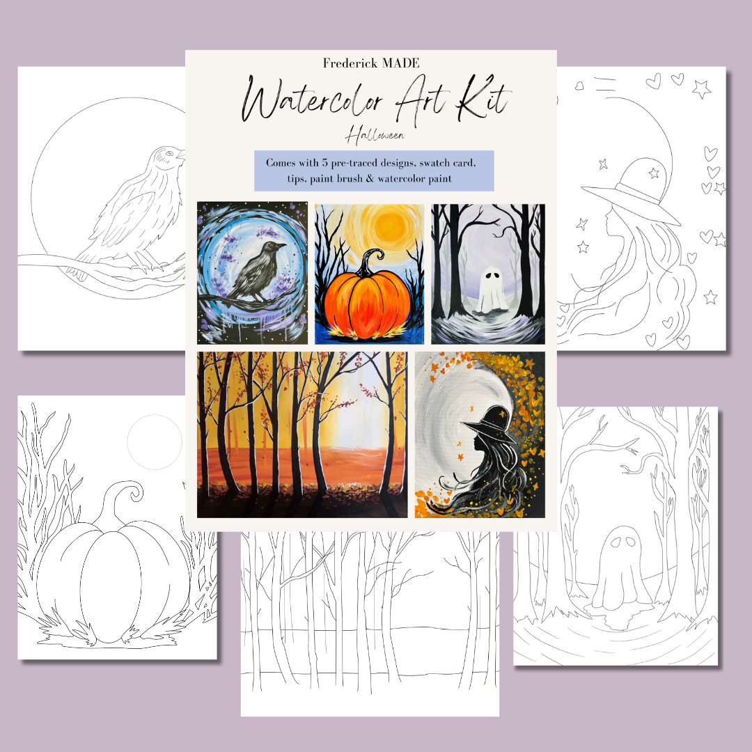 These kits are designed and made in-house. Each kit comes with 5 pre-traced designs on watercolor paper, a watercolor tip sheet (new), swatch card to practice your designs, and practice sheet, PLUS an 8-color set of watercolor paint and paint brush.
