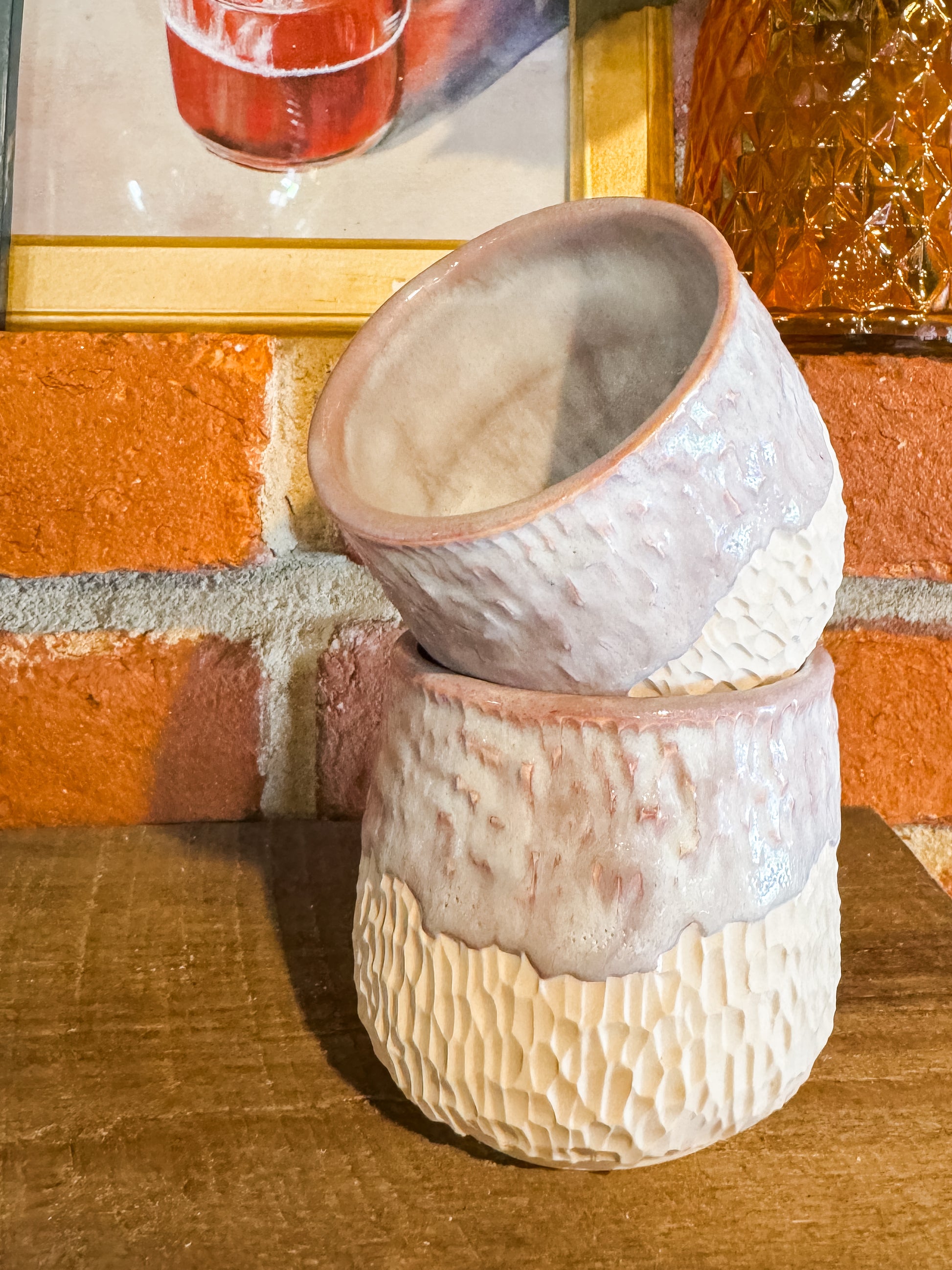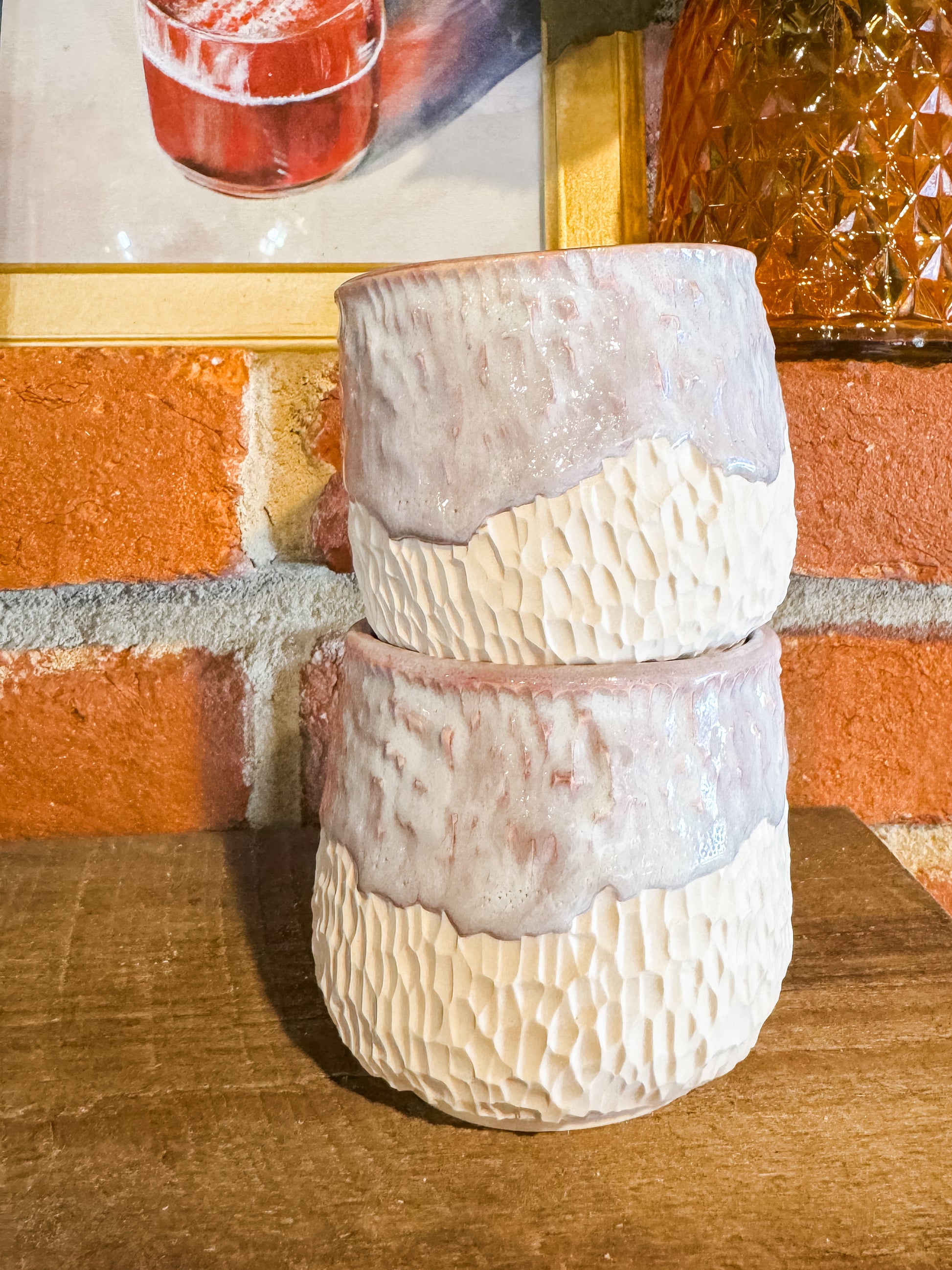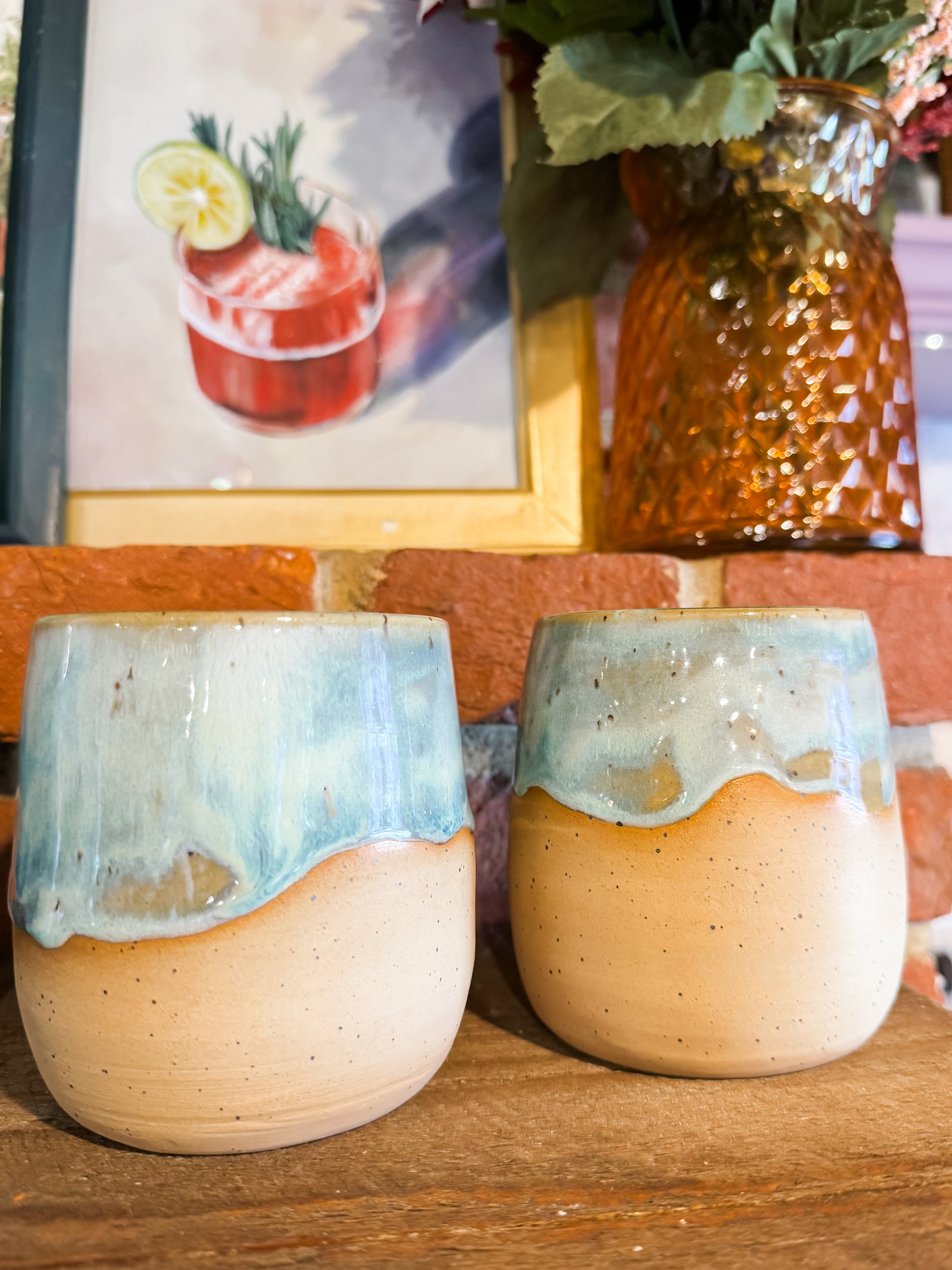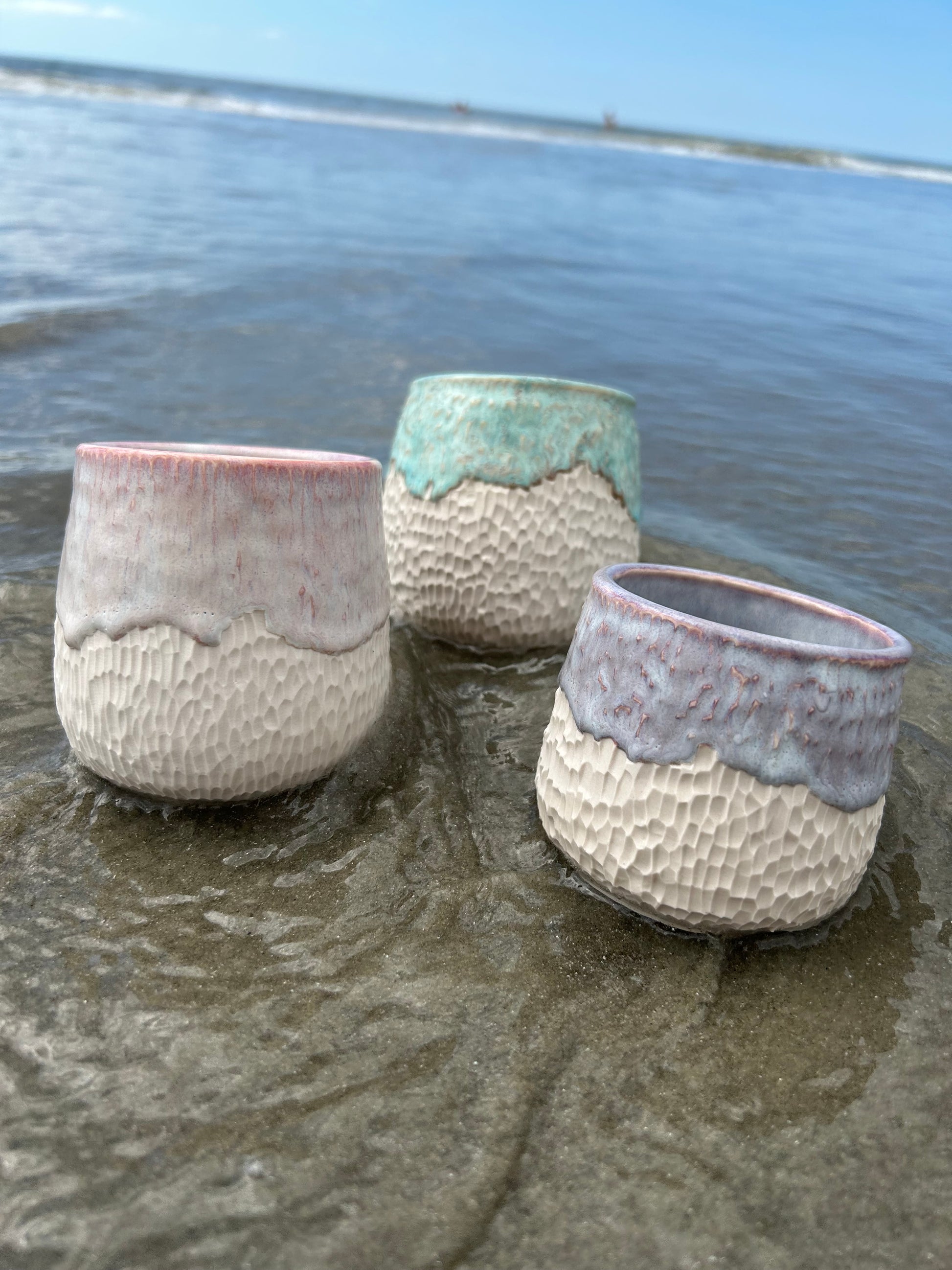 Handmade ceramic cups from Sam of Calm Waters Pottery. Each cup is hand carved and dipped in unique glaze colors. Our current “summer sippers” are available in teal, lavender, and pink.