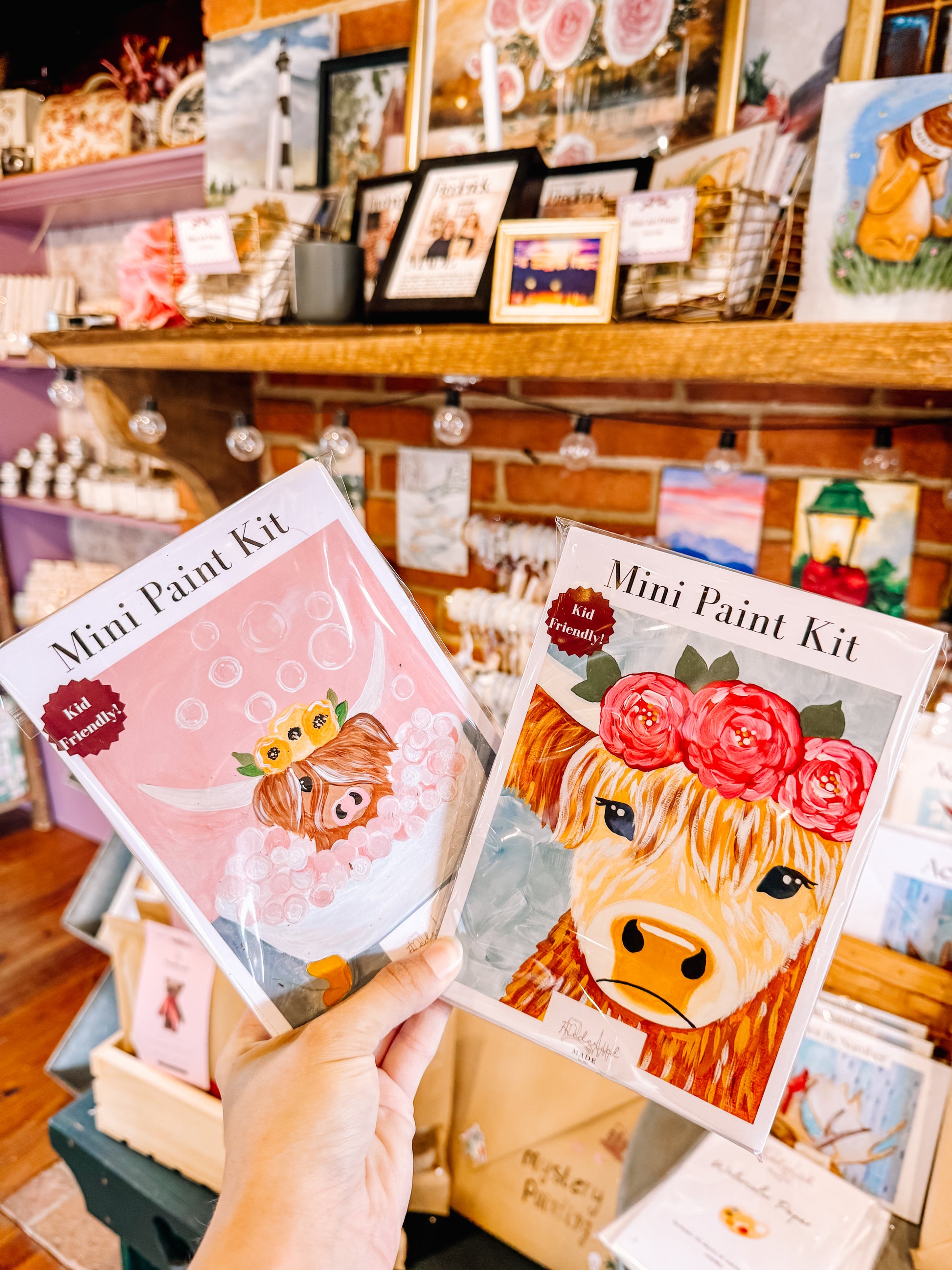 New kids paint kits are here! These miniature paint kits include a pre-traced canvas, paint and brush. Each kit comes will a small instruction card that tells you the basics of painting.