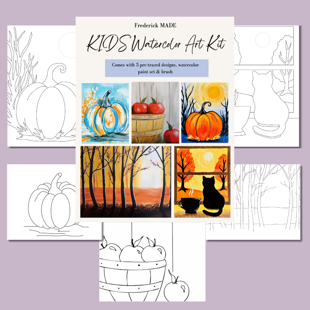 Each watercolor kit for kids includes 5 hand-traced images on 8x10 inch watercolor paper, along with a set of kids watercolor paint and a paint brush!