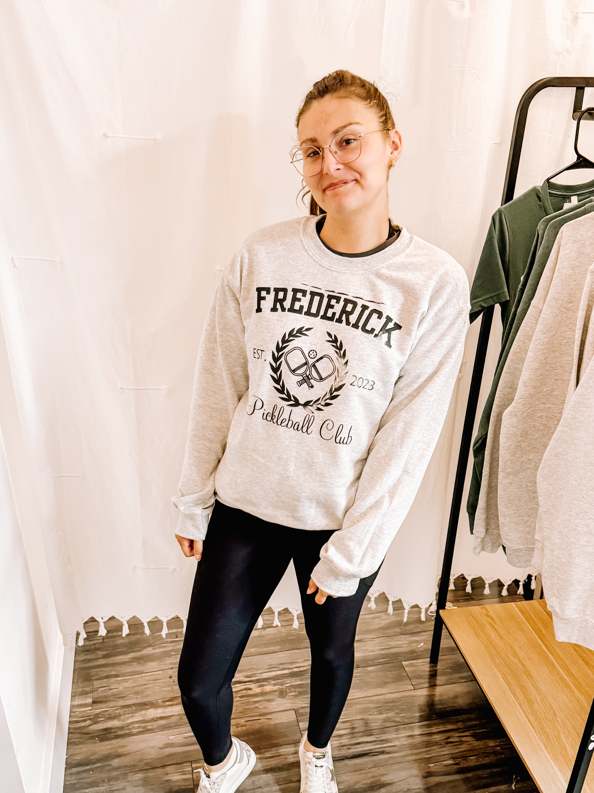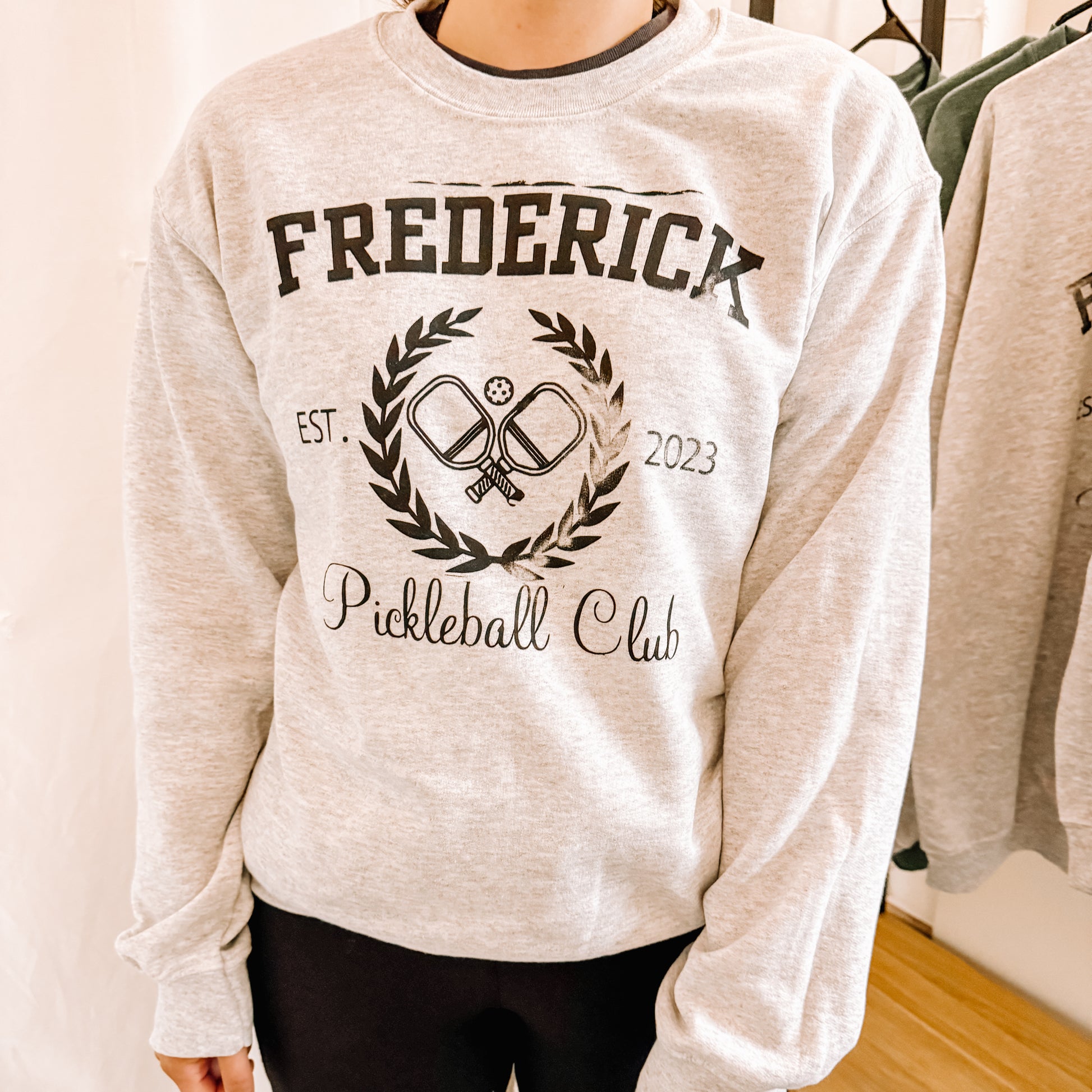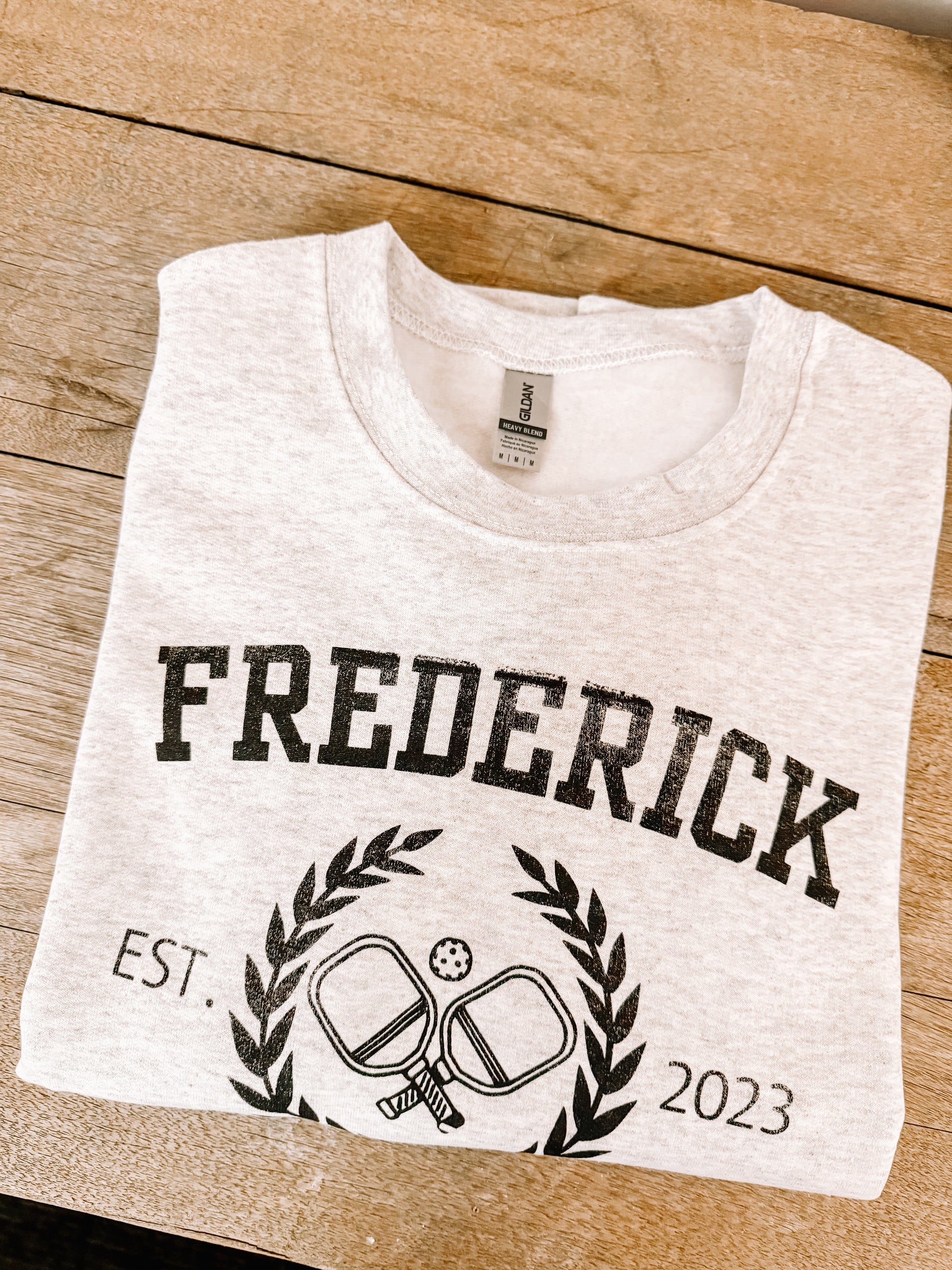 Designed and printed at Frederick MADE, cozy up this fall with our new pickleball sweatshirt. Vintage-Inspired design, adult unisex sizes