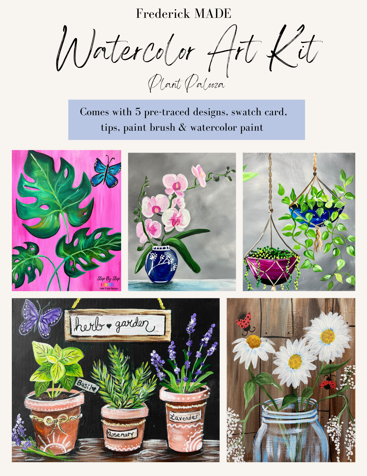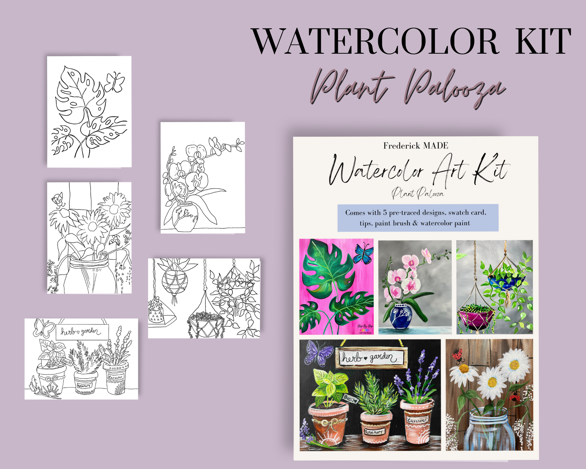 These kits are designed and made in-house. Each kit comes with 5 pre-traced designs on watercolor paper, a watercolor tip sheet (new), swatch card to practice your designs, and practice sheet, PLUS an 8-color set of watercolor paint and paint brush.
