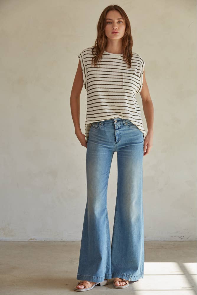 Knit Polyester Cotton Rayon Striped Round Neck Sleeveless Top With Front Pocket And Side Slits. Made in the USA!