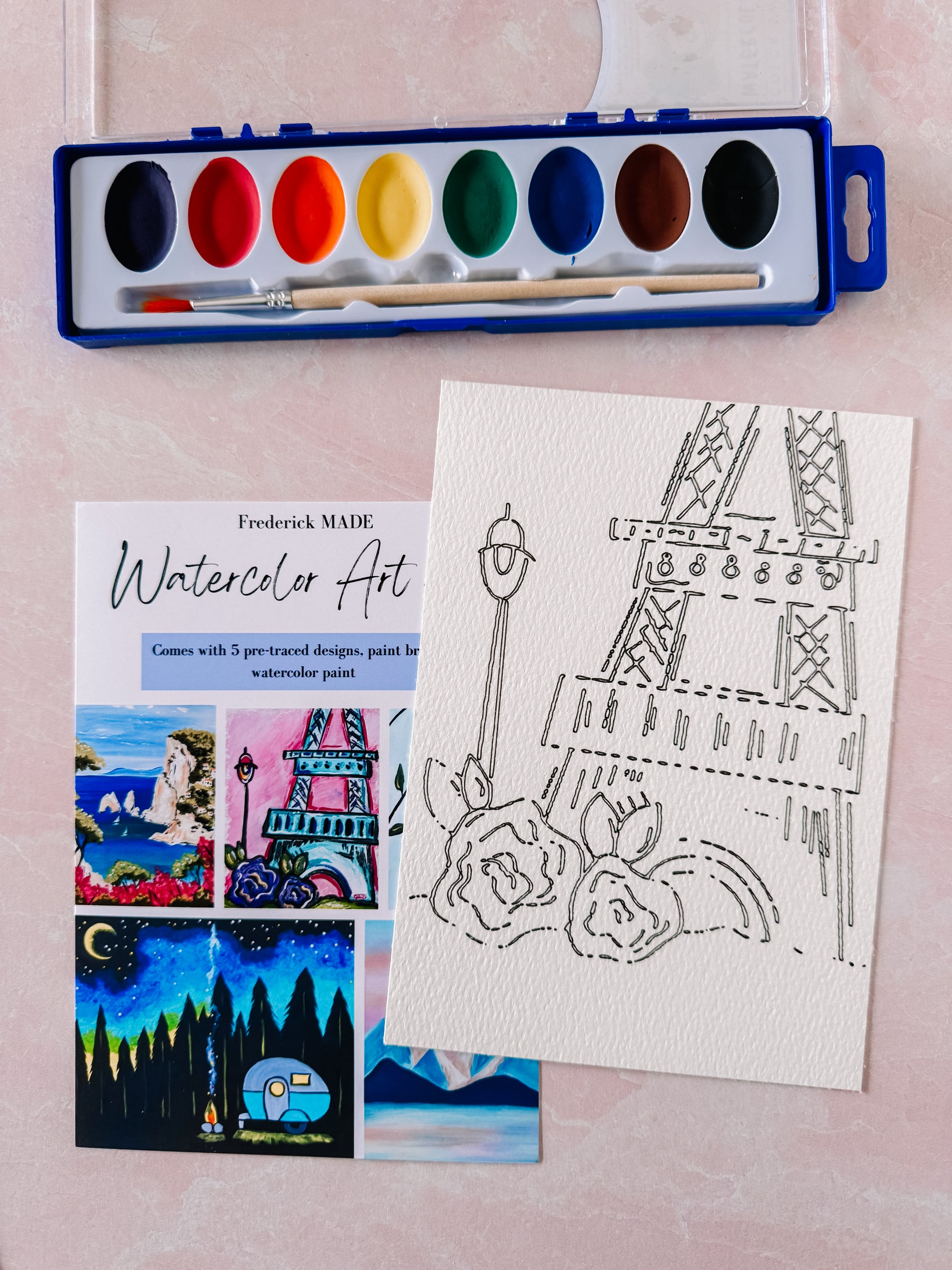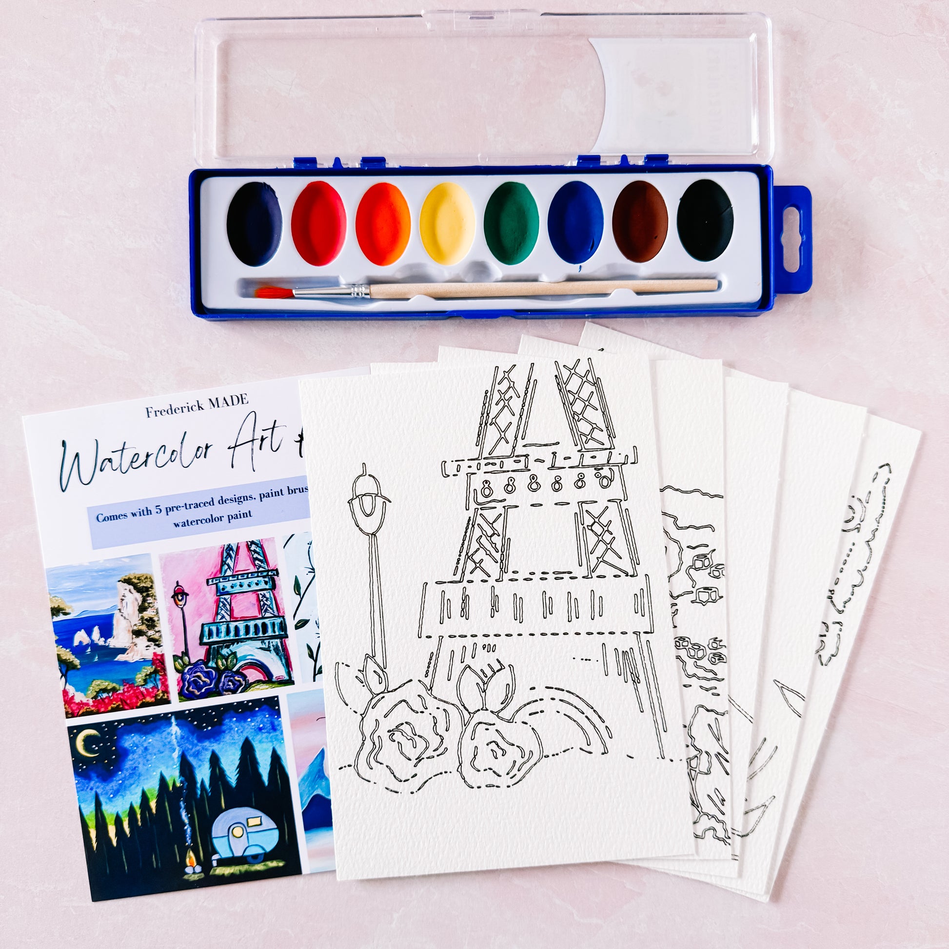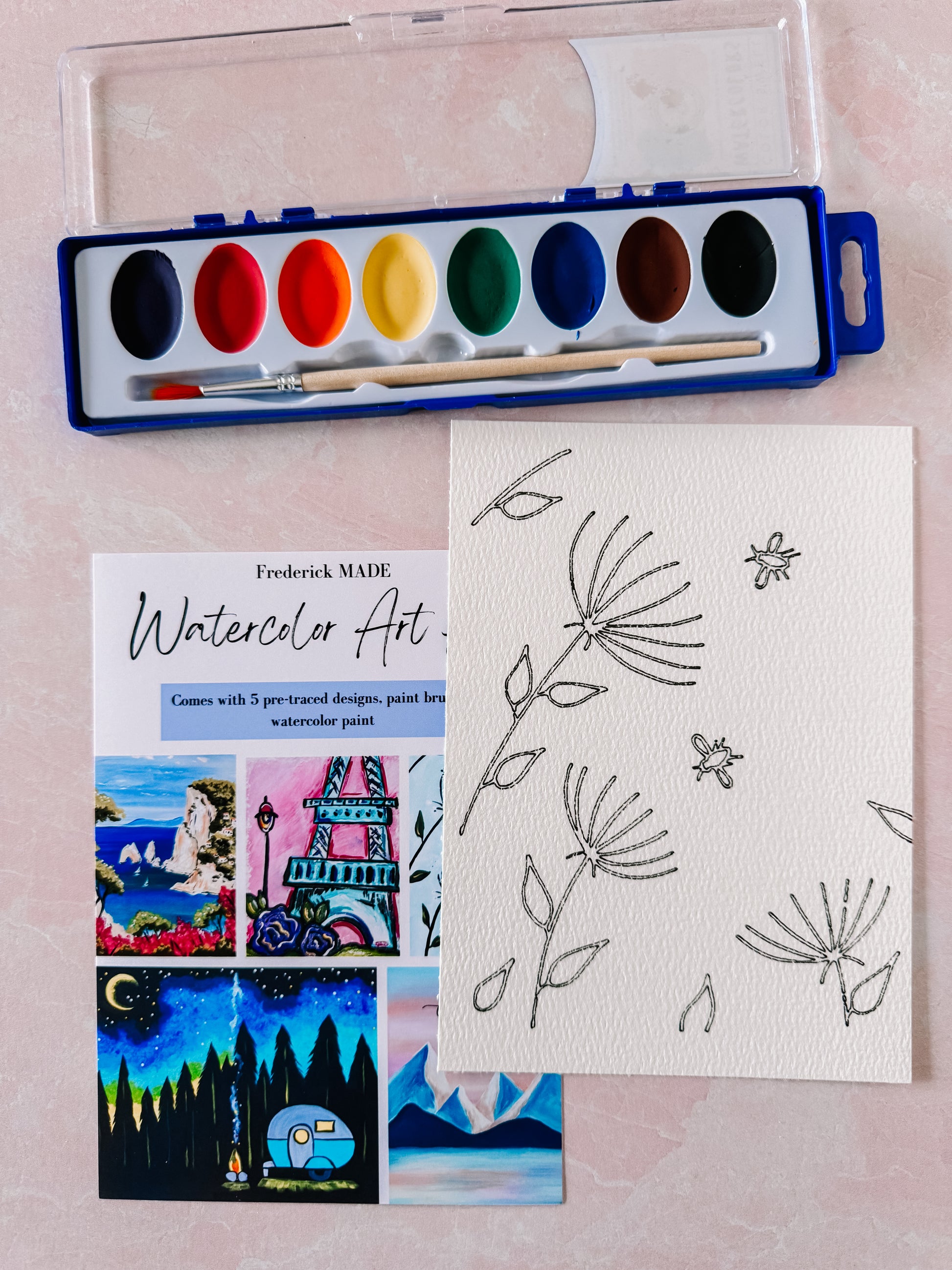 These kits are designed and made in-house. Each kit comes with 5 pre-traced designs on watercolor paper, a watercolor tip sheet (new), swatch card to practice your designs, and practice sheet, PLUS an 8-color set of watercolor paint and paint brush.