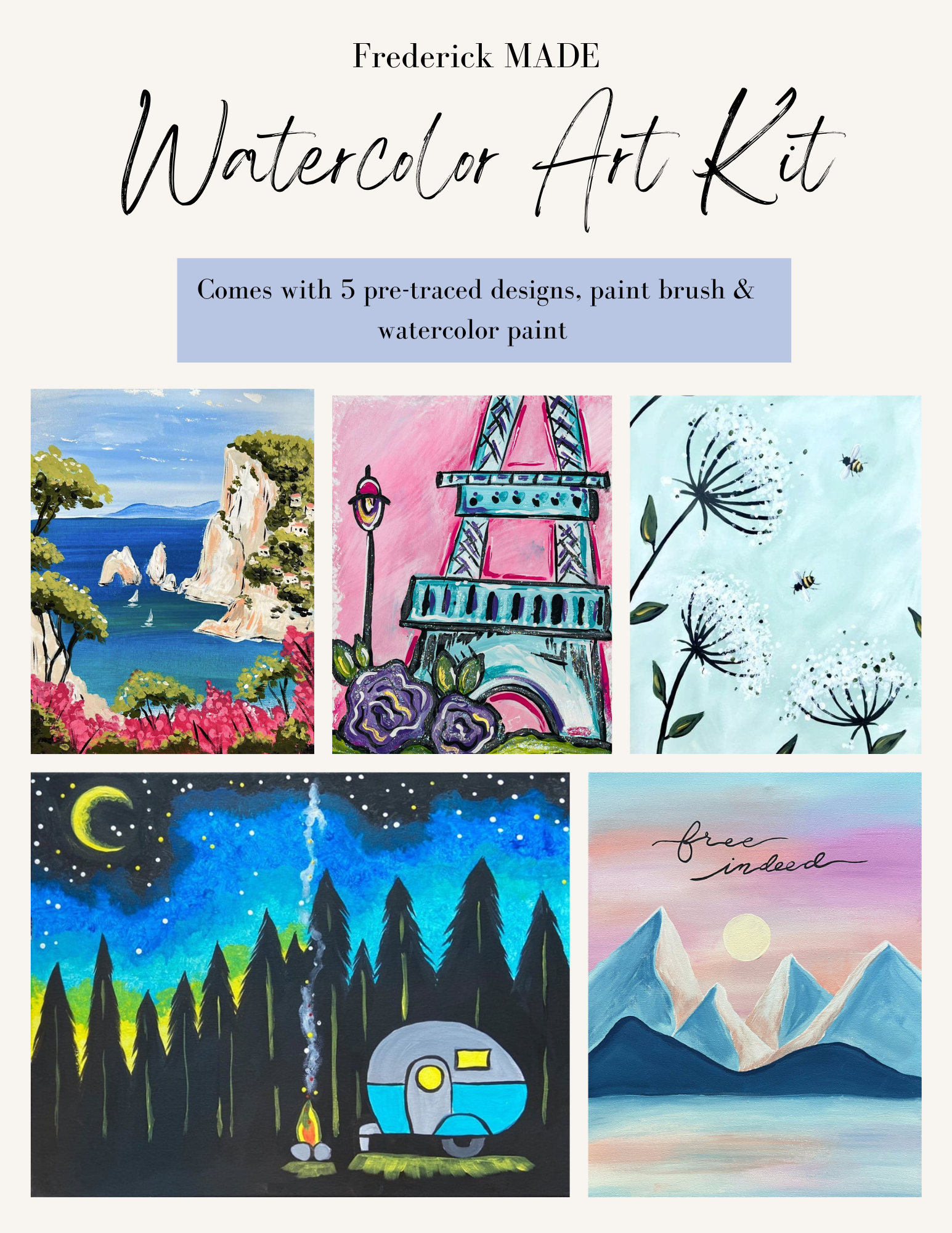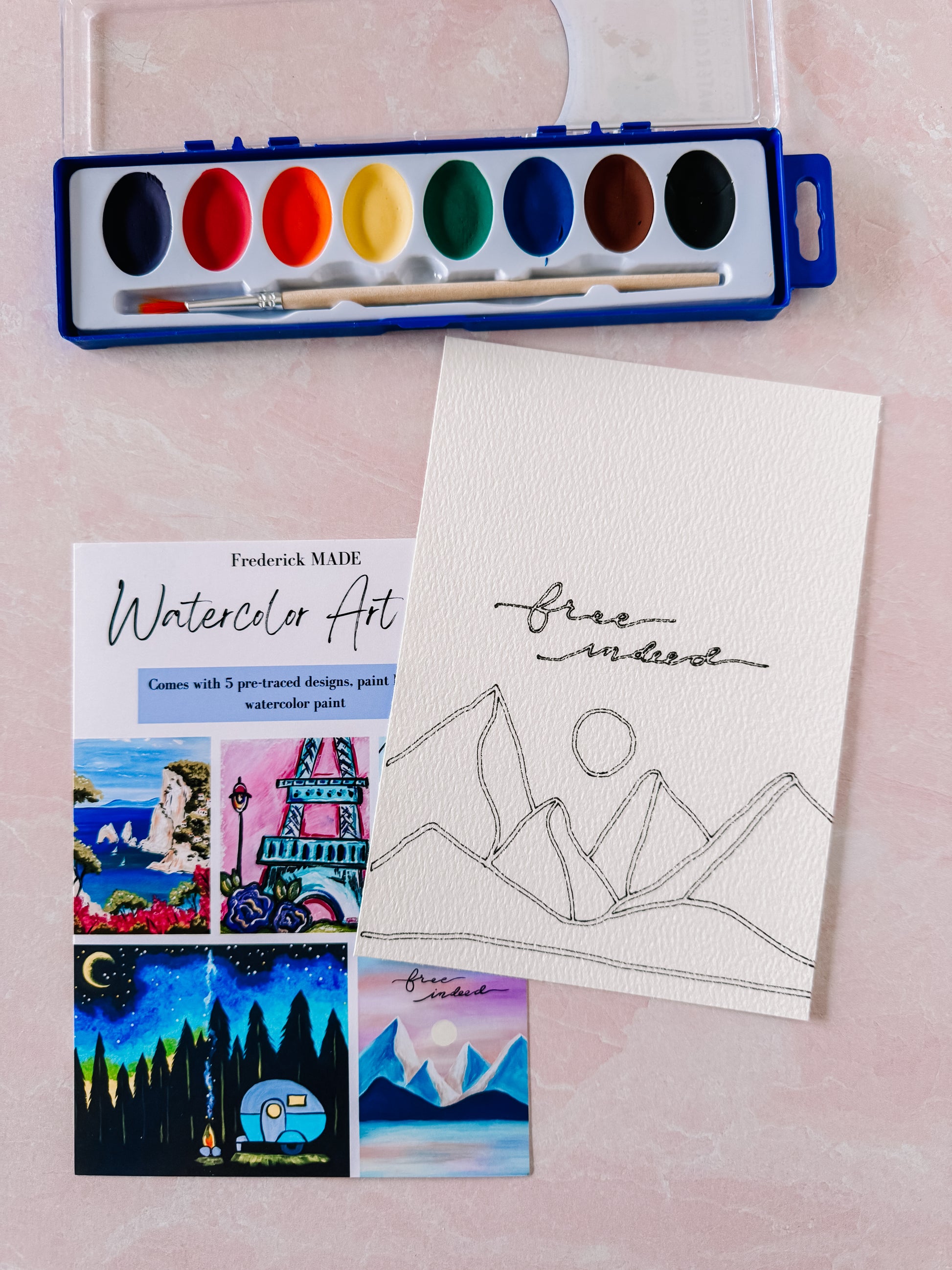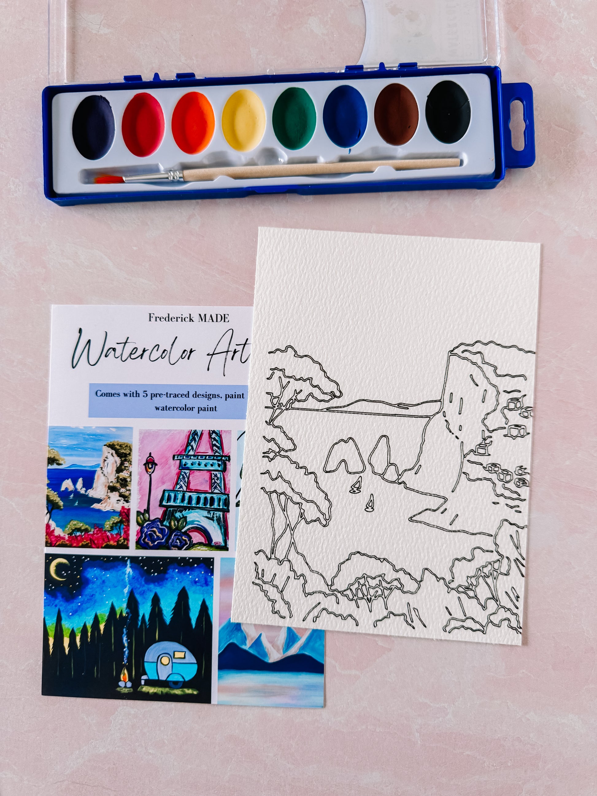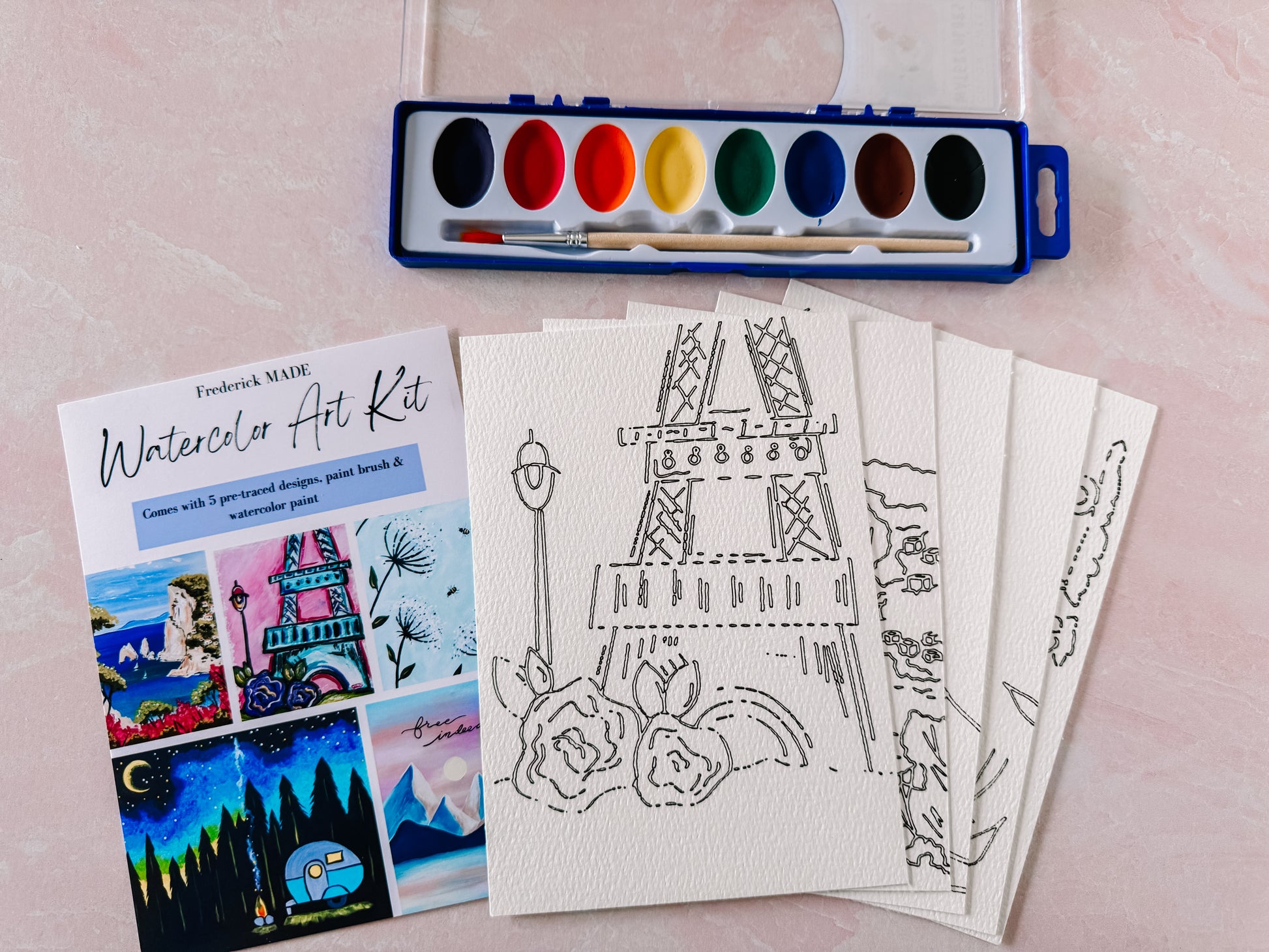 These kits are designed and made in-house. Each kit comes with 5 pre-traced designs on watercolor paper, a watercolor tip sheet (new), swatch card to practice your designs, and practice sheet, PLUS an 8-color set of watercolor paint and paint brush.