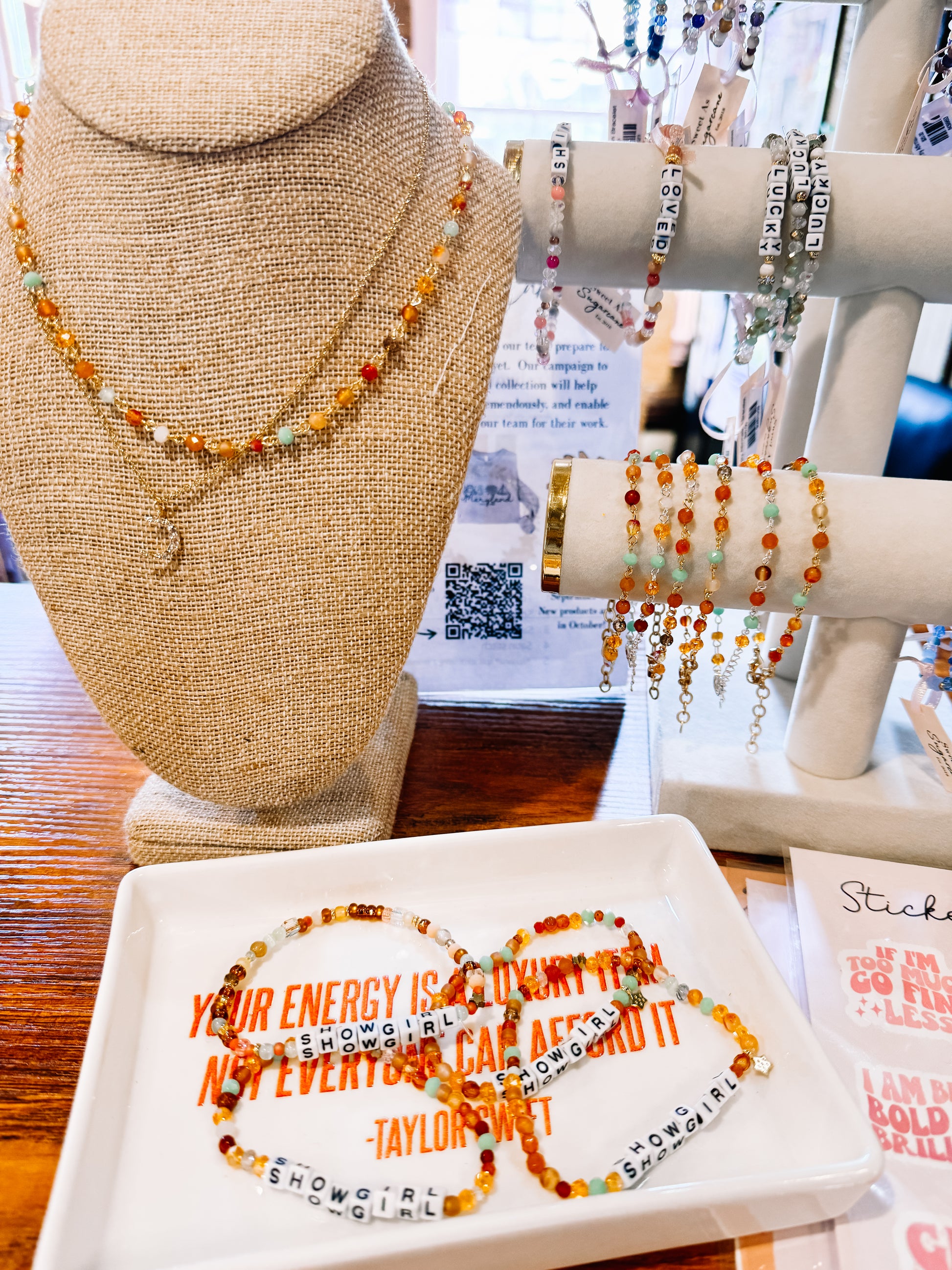 Handmade beaded chain bracelet available in gold or silver with our specially curated “showgirl” bead mix!
