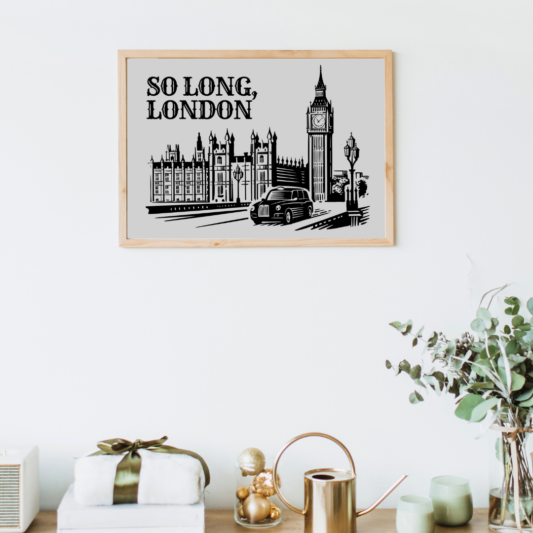 Elevate your home decor with our original Art Prints. Available in two sizes, 5x7 and 8x10 inches, our in-house printing ensures high quality using premium art paper and ink. Add a touch of sophistication to any room with this beautifully crafted art piece. So Long London print part of the Swiftie Collection.